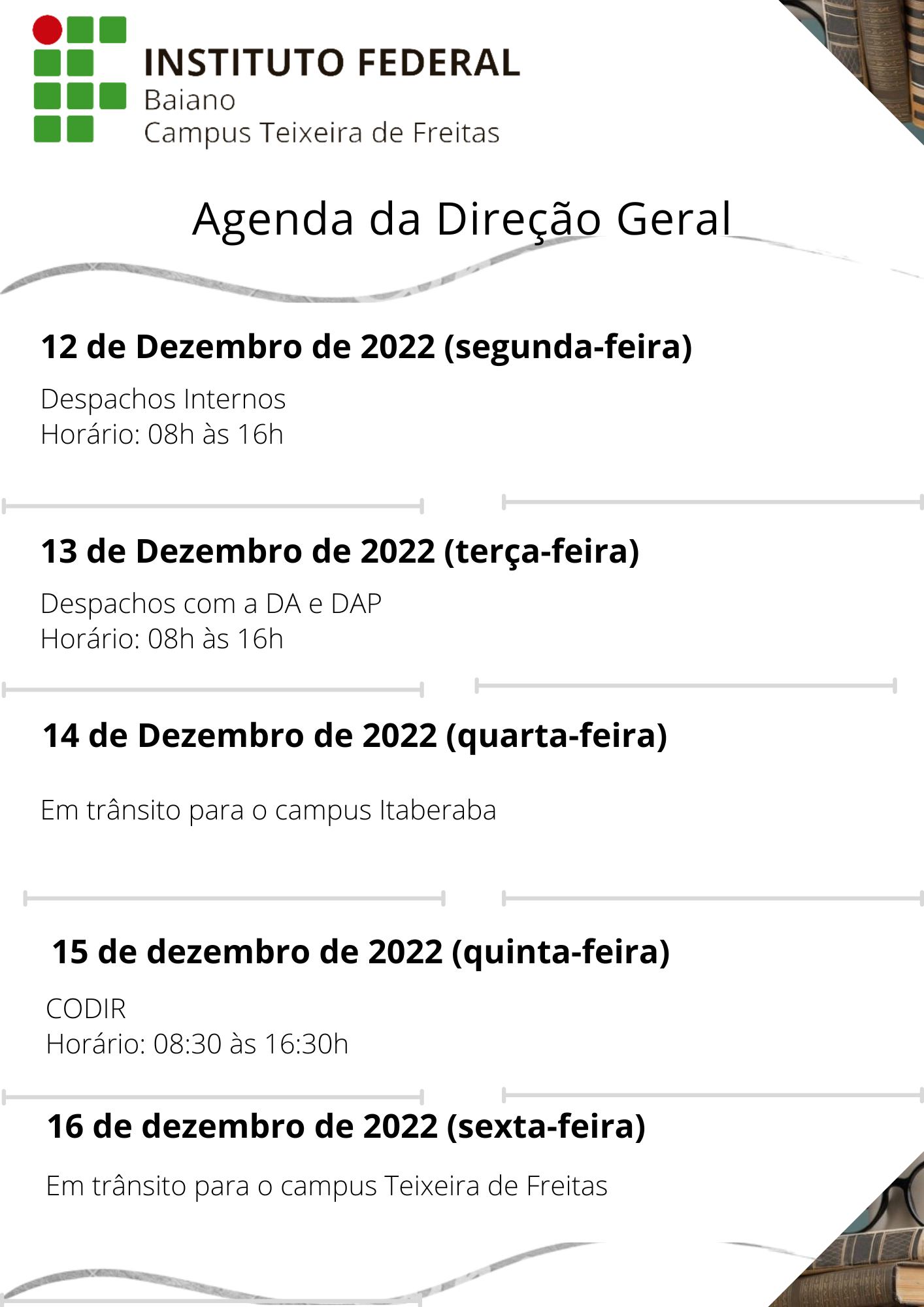 Agenda da Direção Geral de 12 a 16 de Dezembro de 2022
