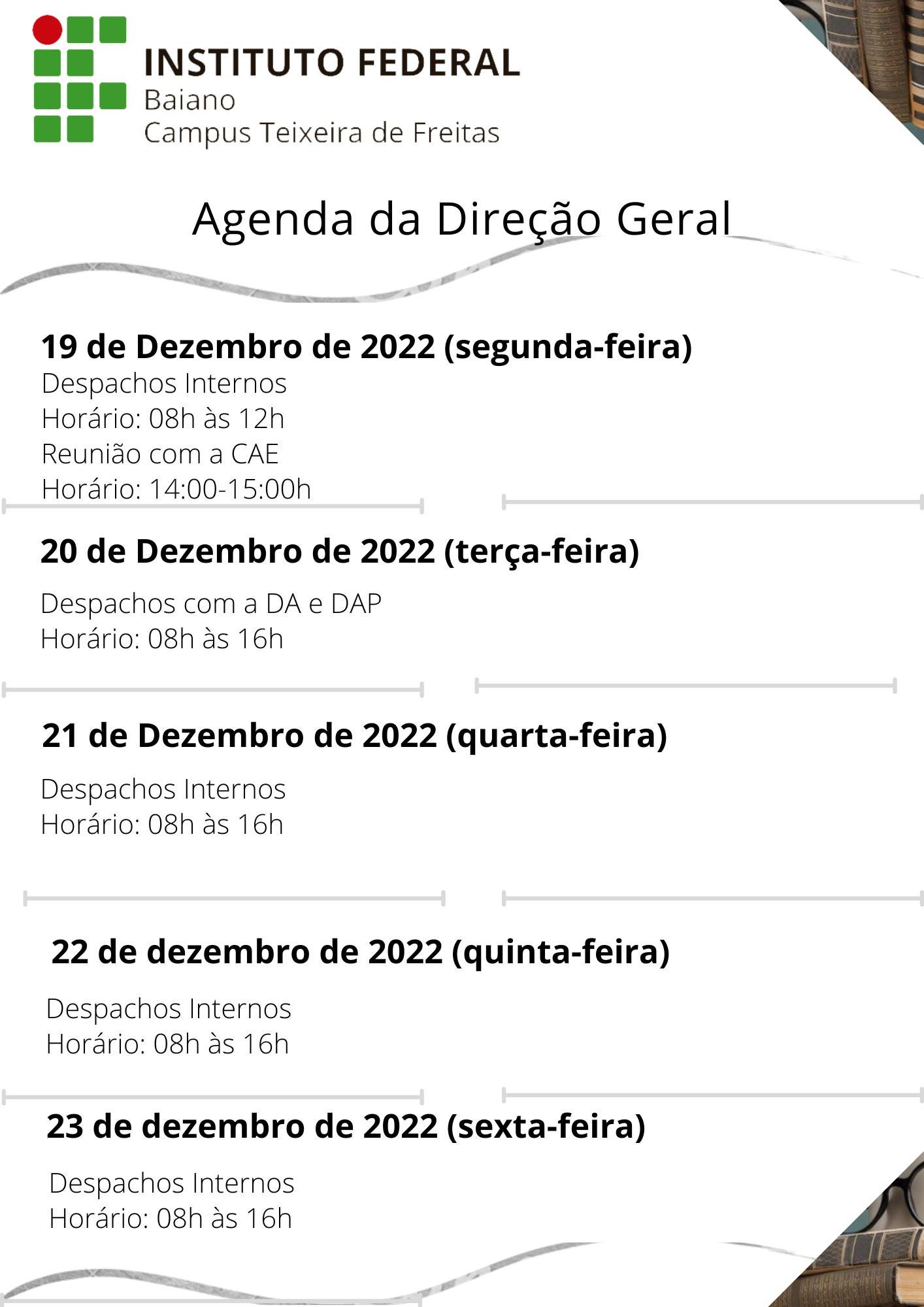 Agenda da Direção Geral de 19 a 23 de Dezembro de 2022
