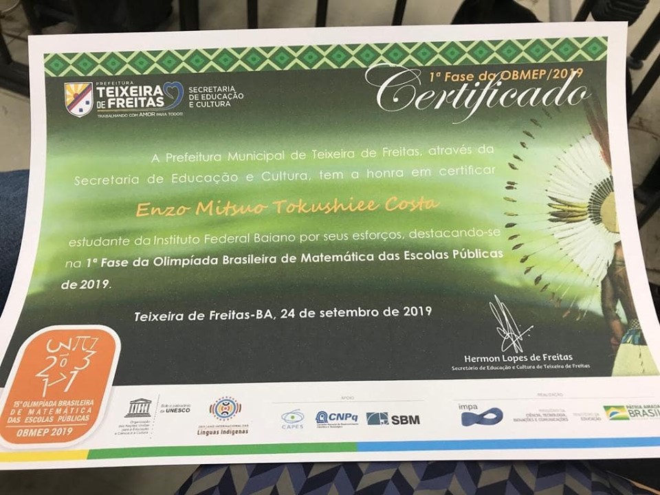 A prefeitura da cidade de Teixeira de Freitas através da Secretaria de Educação e Cultura certificou o estudante do IF Baiano, Enzo Mitsuo Tokushige Costa do 1° ano do curso Técnico em Administração, por seus esforços, destacando-se na 1° Fase da OBMEP 2019.