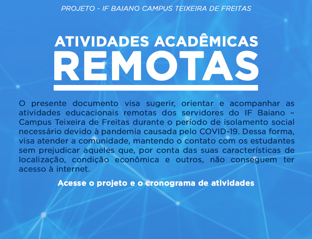 O presente documento visa sugerir, orientar e acompanhar as atividades educacionais remotas dos servidores do IF Baiano – Campus Teixeira de Freitas durante o período de isolamento social necessário devido à pandemia causada pelo COVID-19. Dessa forma, visa atender a comunidade, mantendo o contato com os estudantes sem prejudicar aqueles que, por conta das suas características de localização, condição econômica e outros, não conseguem ter acesso à internet.