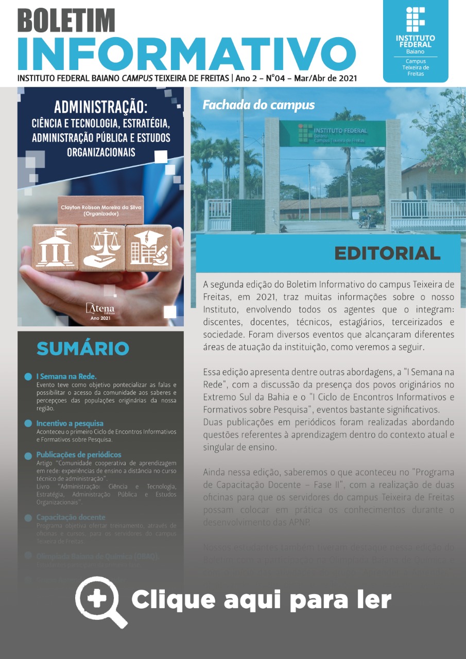 A Direção Geral, por meio do Núcleo de Comunicação e da Comissão de Apoio ao Núcleo de Comunicação e Eventos, institui o Boletim Informativo do Instituto Federal Baiano – campus Teixeira de Freitas. O documento tem por objetivo informar bimestralmente a comunidade interna e externa sobre as ações e eventos realizados no âmbito do campus, bem como documentos institucionais relevantes para a comunidade. O material será divulgado principalmente por meio digital, no sítio eletrônico. Além disso, também será disponibilizado unidades impressas em pequena tiragem, para assegurar o acesso às informações para todas as comunidades.