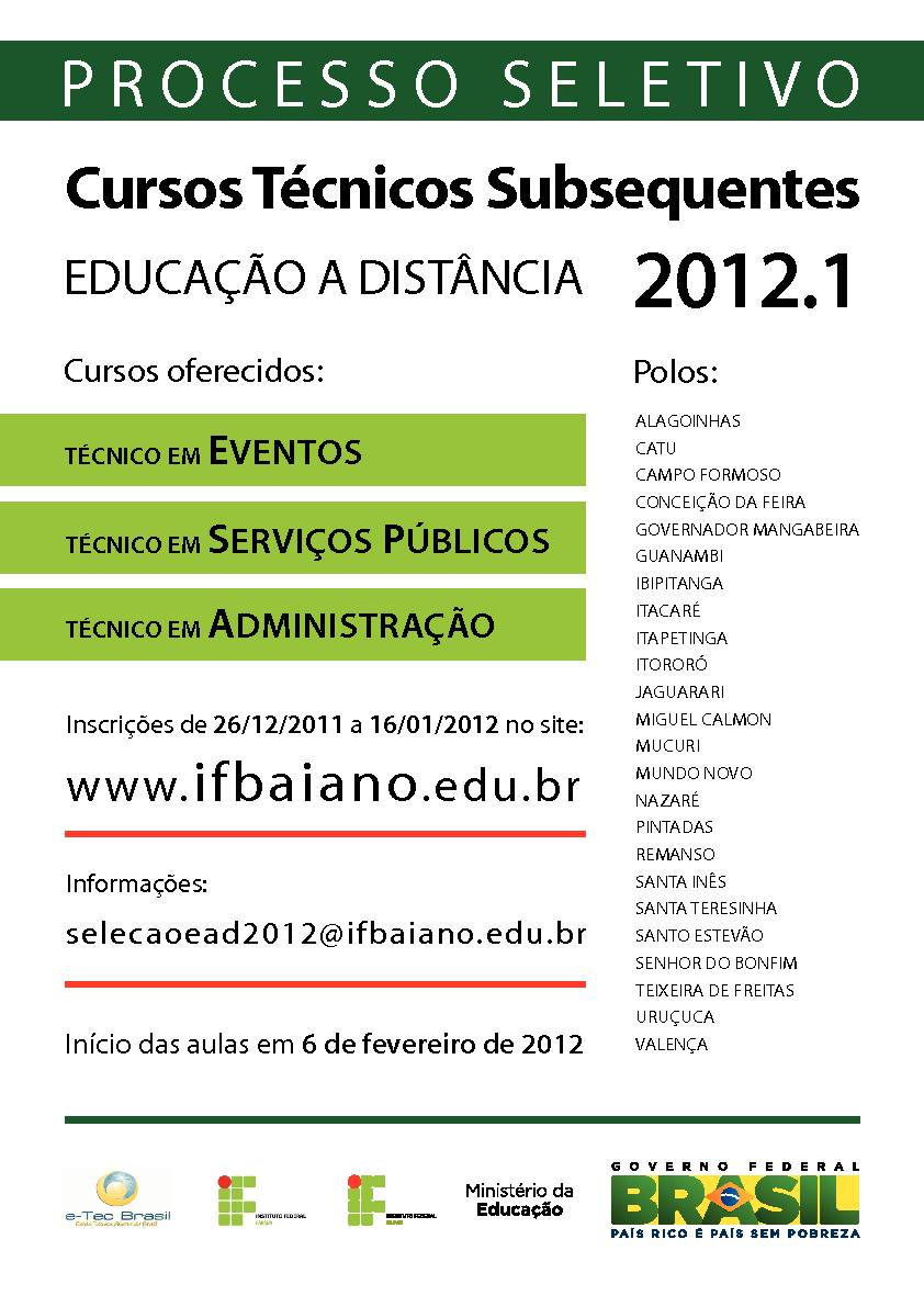 O Campus de Teixeira de Freitas seguem abertas as inscrições, até dia 23 de janeiro, para o Curso Técnico à Distância em Serviços Públicos.