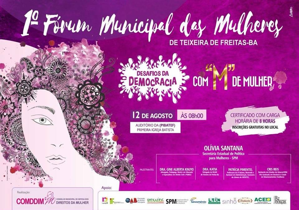 O IF Baiano – Campus Teixeira de Freitas apoiará a realização do I Fórum Municipal das Mulheres, que acontecerá no dia 12 de agosto, das 7 às 17 horas, no auditório da Primeira Igreja Batista em Teixeira de Freitas.