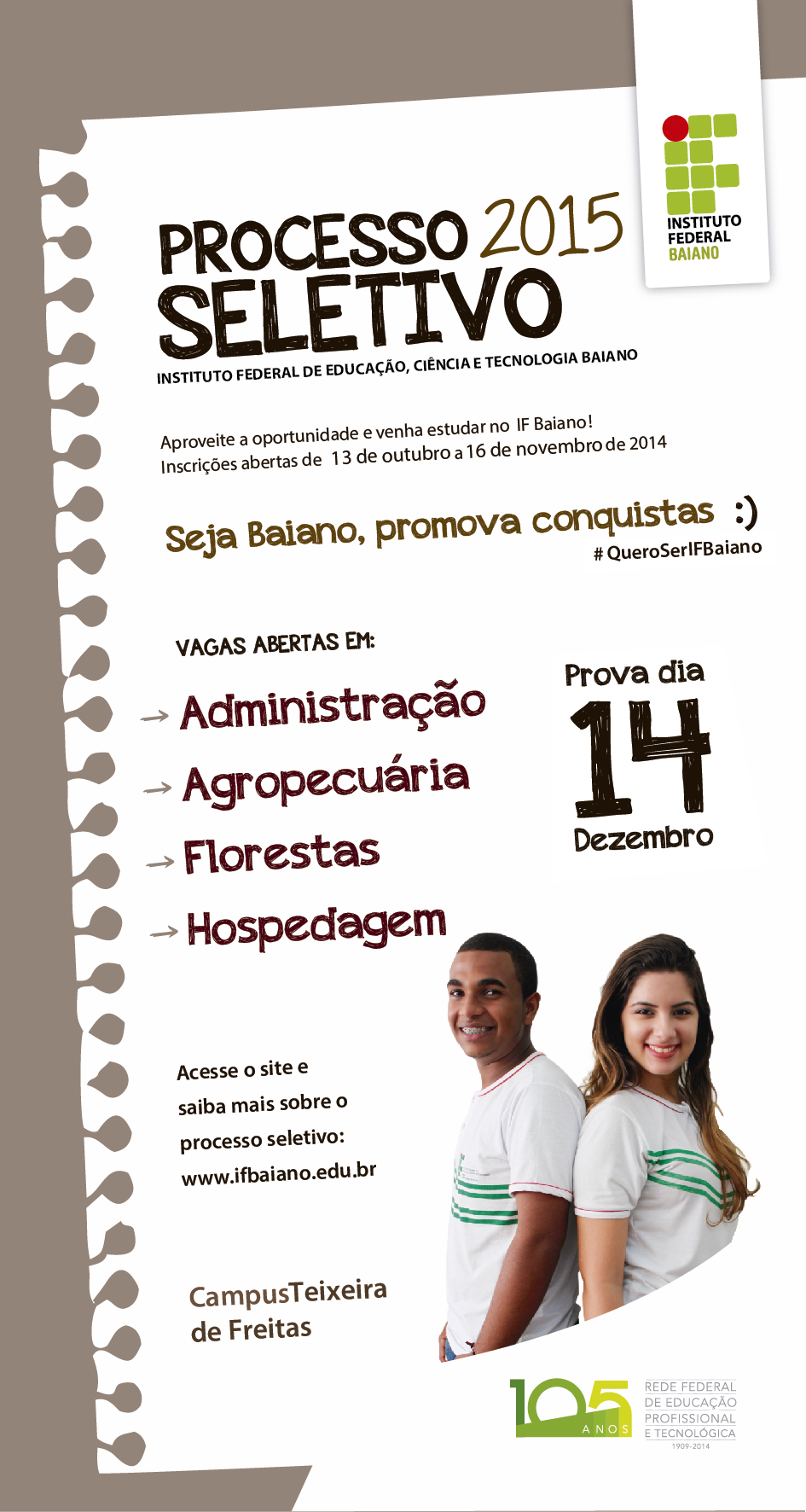 No período de 13 de outubro a 16 de novembro, o Instituto Federal Baiano (IF Baiano) inscreve para o Processo Seletivo 2015 para ingresso de novos estudantes. São 2.500 vagas ofertadas em cursos técnicos distribuídos pelos 10 campi localizados nas cidades de Catu, Senhor do Bonfim, Guanambi, Santa Inês, Governador Mangabeira, Bom Jesus da Lapa, Valença, Teixeira de Freitas, Uruçuca e Itapetinga. As inscrições serão feitas apenas pela internet, no site do Instituto, e terá taxa de R$ 10,00. Interessados em solicitar isenção têm até o dia 31 de outubro para enviar pedido.