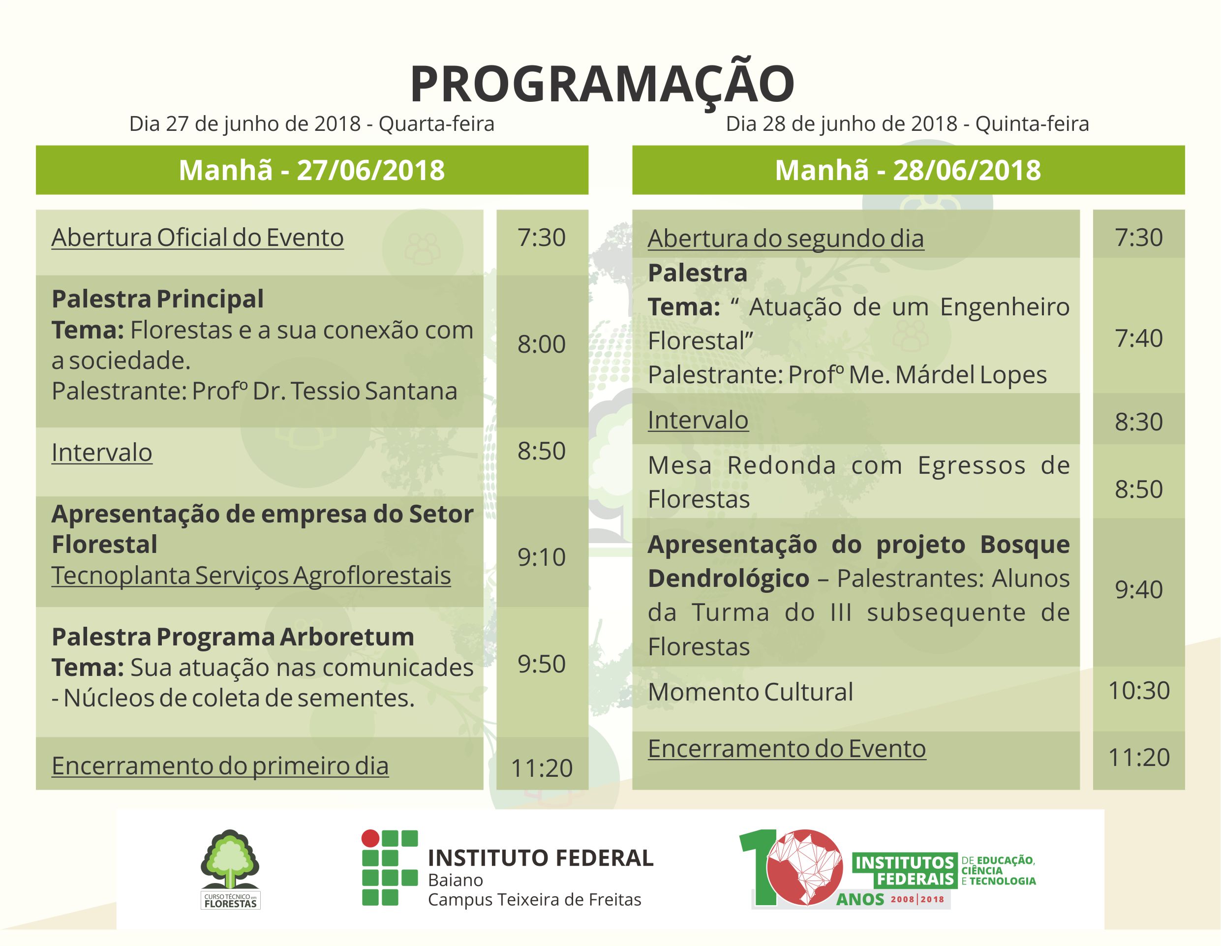 Nos dias 27 e 28 de junho de 2018 o Instituto Federal Baiano- IF Baiano Campus Teixeira de Freitas – realizará o I Encontro Técnico Florestal com o tema: Florestas e sua conexão com a Sociedade, organizado pelos professores Nayara Souza, Priscila Ferreira e Márdel Lopes, juntamente com os alunos do curso.