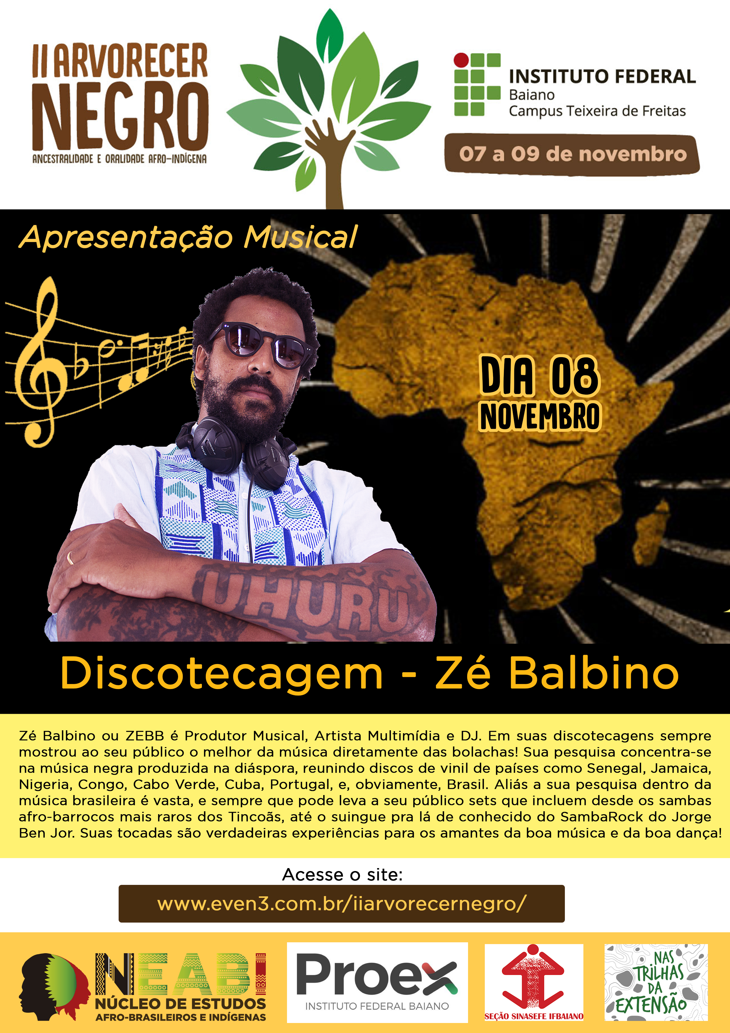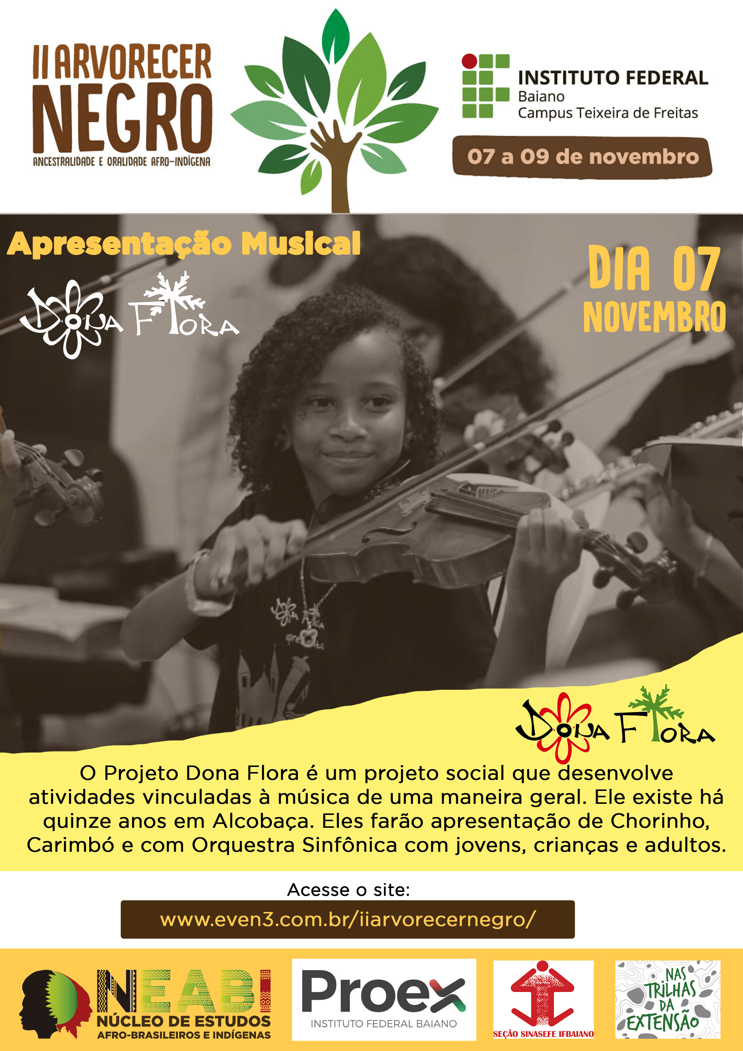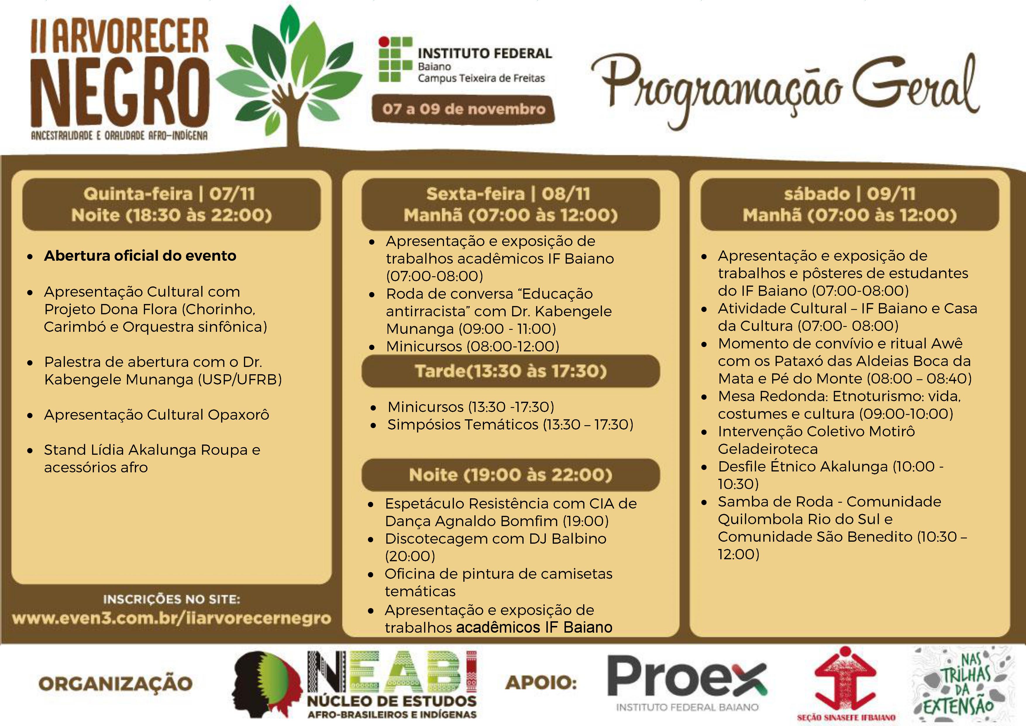 O segundo Arvorecer Negro: Ancestralidade e Oralidade Afro-indígena é um evento organizado pelo Núcleo de Estudos Afro-Brasileiros e Indígenas (NEABI) do Instituto Federal de Educação, Ciência e Tecnologia Baiano do campus Teixeira de Freitas que será realizado entre os dias 07 a 09 de novembro de 2019. O mês de novembro deve ser entendido como momento de culminância de uma série de ações voltadas ao fortalecimento das discussões acerca da inserção e lutas históricas das comunidades negras no Brasil. O Extremo Sul da Bahia é antes de mais nada uma zona de resistência. A presença de inúmeras comunidades remanescentes quilombolas e a carência de uma maior interação entre estas e o meio acadêmico regional faz com que o II Arvorecer Negro: Ancestralidade e Oralidade Afro-indígenas apareça como uma contribuição da nossa instituição como espaço propício para interação destes universos.