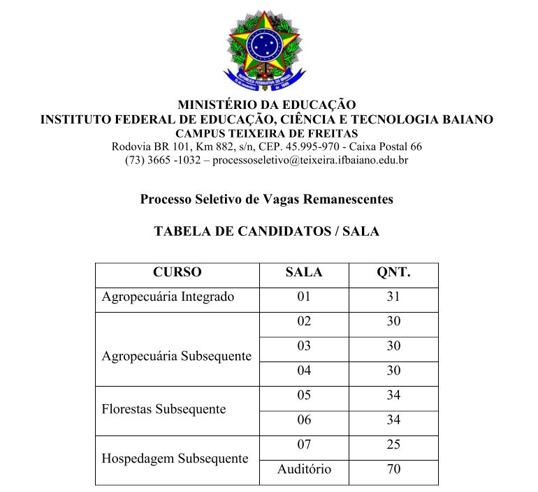 Confira a lista de homologados para o Processo Seletivo 2013, vagas remanescentes do IF Baiano – campus Teixeira de Freitas.