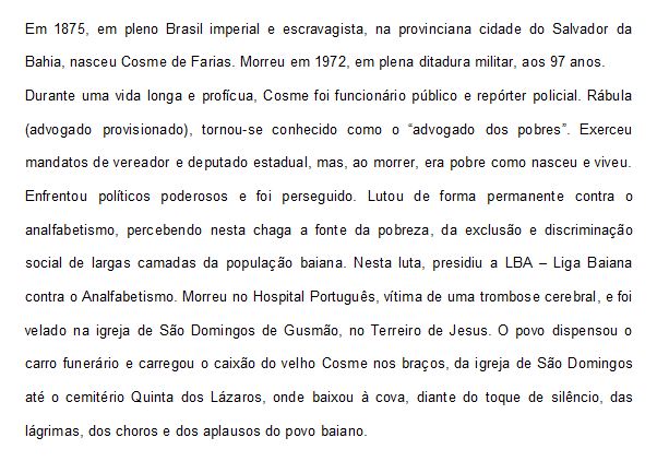 O IF BAIANO (Instituto Federal Baiano) – Campus Uruçuca exibirá dia 07 de agosto, quarta-feira, às 14h, no auditório da instituição, em avant première, o filme inédito Quitanda da Liberdade, do cineasta Marcelo Oliveira. A sessão destina-se ao público interno (professores, alunos e funcionários), bem como ao público externo (sociedade uruçuquense). Quitanda da Liberdade é um documentário, média-metragem, de aproximadamente 52 minutos, sobre a lendária figura do Major Cosme de Farias, hoje nome do bairro onde residiu em Salvador.