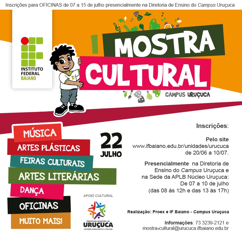No dia 22 de julho, o Campus Uruçuca estará promovendo a Mostra Cultural. As inscrições para as apresentações poderão ser feitas no período de 20 de junho a 10 de julho pela internet e de forma presencial, no período de 07 a 10 de julho. Podem se inscrever as comunidades internas (discentes, servidores, trabalhadores terceirizados) e externas (cidadãos uruçuquenses e de municípios do entorno) ao IF Baiano, que atuem nos diferentes segmentos artístico culturais. Os interessados em participar de Oficina(s) da Mostra Cultural deverão inscrever-se presencialmente no Campus Uruçuca, na DDE (Diretoria de Ensino) no período de 07 a 15 de julho, das 08 às 12 horas e das 13 às 17 horas.