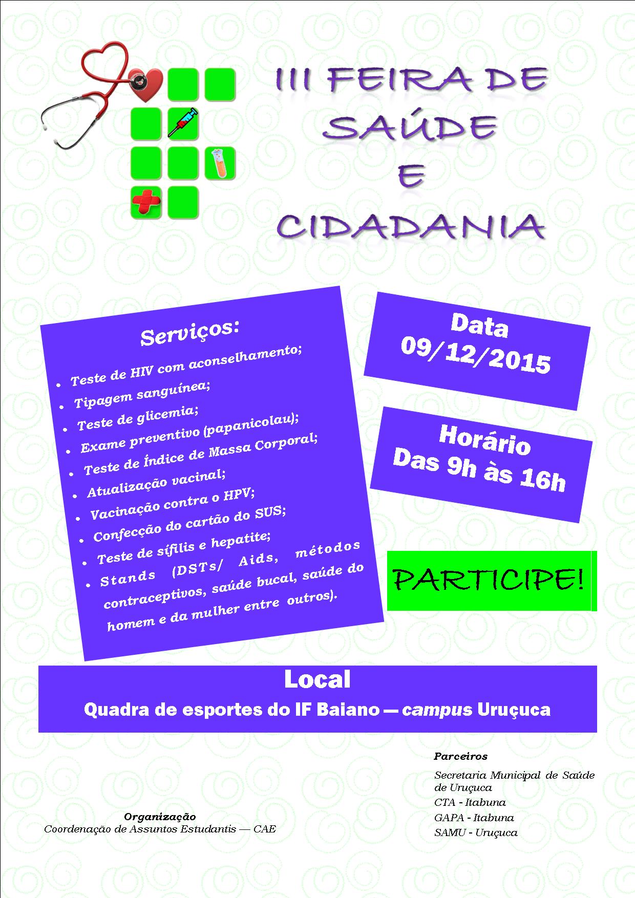 Acontecerá no dia 09.12.2015 a III Feira de Saúde e Qualidade de Vida do IF Baiano – campus Uruçuca. A ação é uma iniciativa da Coordenação de Assuntos Estudantis – CAE e tem como objetivo promover ações de saúde voltadas para a comunidade acadêmica, orientando sobre a importância dos cuidados com a saúde para a obtenção de uma vida mais saudável.