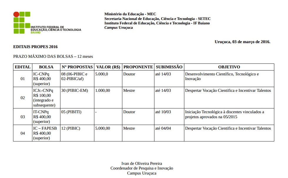 Reitoria: Rua do Rouxinol, nº 115, Imbuí, Salvador-BA. CEP: 41720-052. CNPJ: 10.724.903/0001-79 Telefone: (71) 3186-0001 | E-mail: gabinete@ifbaiano.edu.br