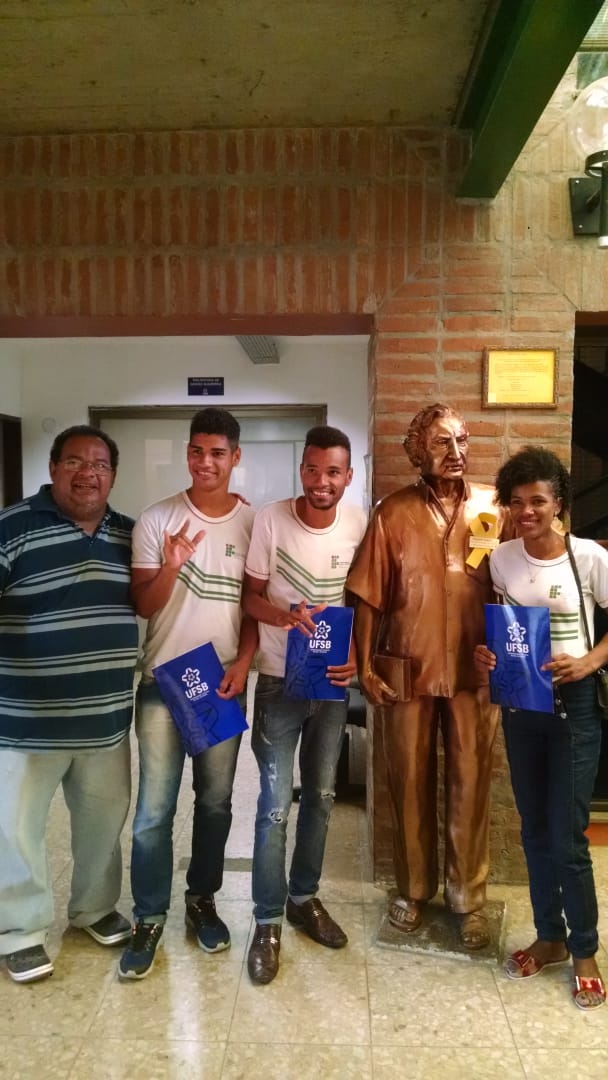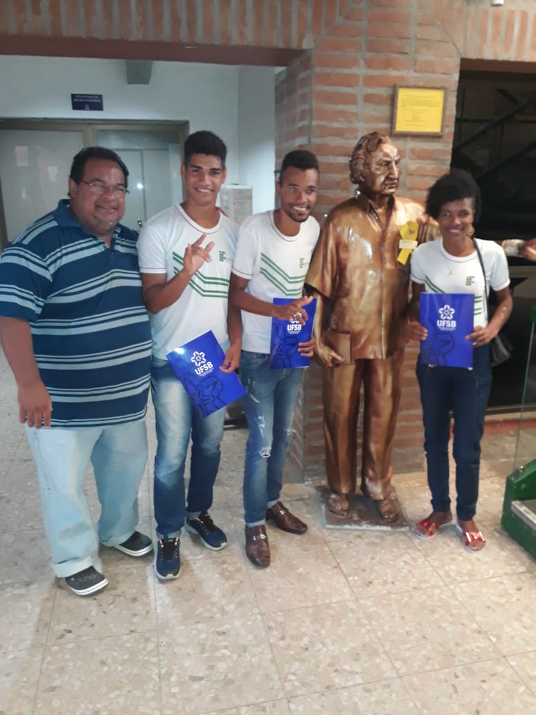 No dia 20 de setembro, os discentes Daiane Conceição Lemos (Curso Técnico em Alimentos), Jeferson Santos da Silva (Curso Técnico em Alimentos) e Robson Conceição Barbosa (Curso Técnico em Agropecuária) estiveram presentes, juntamente com a tradutora/intérprete de Libras Helleni Priscille Oliveira e a docente do Atendimento Educacional Especializado Ana Paula Zerbato, no evento “Mãos que dão voz: Conhecendo a UFSB”, realizado na Universidade Federal do Sul da Bahia (UFSB), campus Jorge Amado, em Itabuna.
