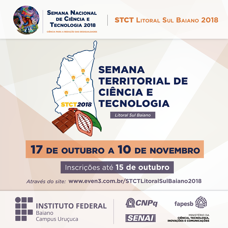 A Semana Territorial de Ciência e Tecnologia (STCT) 2018 está inserida na Semana Nacional de Ciência e Tecnologia e terá como tema “Ciência para a redução das desigualdades”. Ela ocorrerá no período de 15/10 a 10/11 em diversas cidades: Uruçuca, Camacã, Itabuna, Itajuípe, Ilhéus e cidades circunvizinhas.