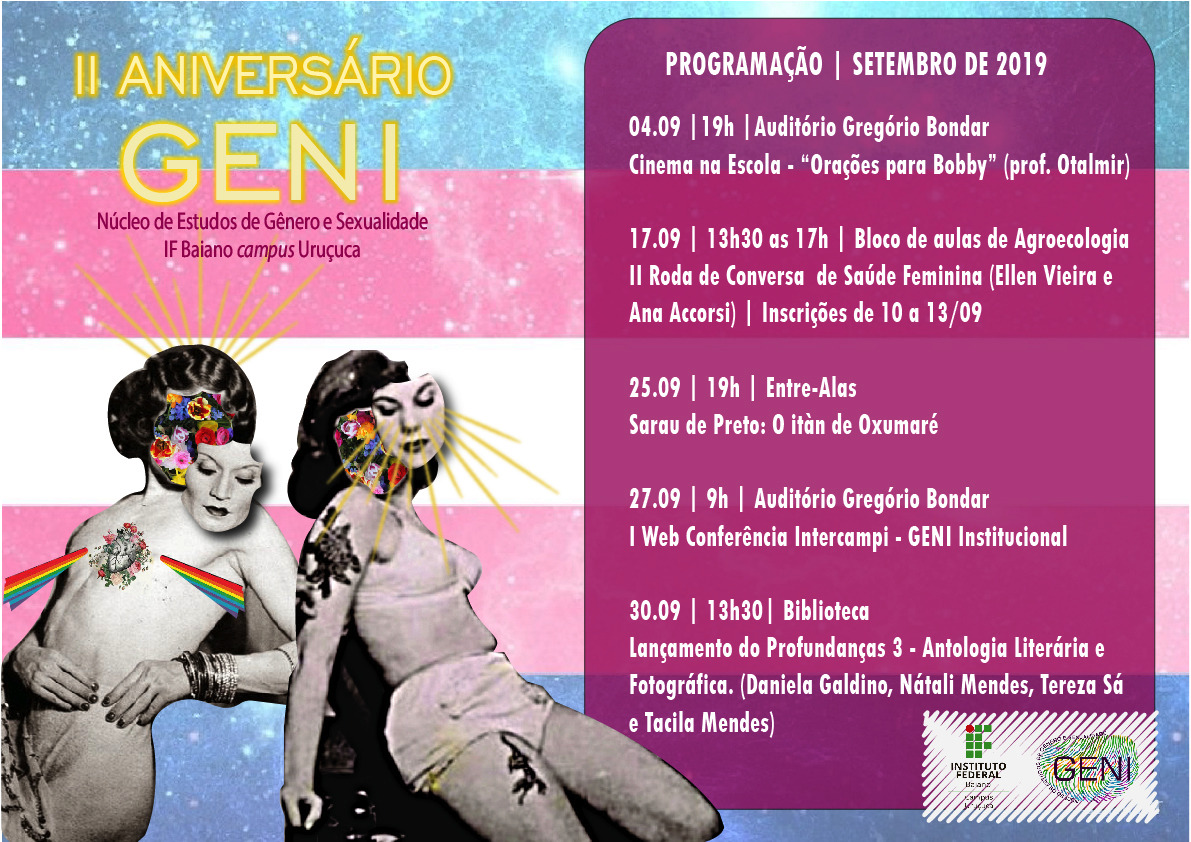 No dia 28 de setembro de 2019, o GENI – Núcleo de Estudos de Gênero e Sexualidade do IF Baiano – Campus Uruçuca completa dois anos de existência! Nesse período o Núcleo desenvolveu diversas ações nas áreas de estudos de gênero e diversidade sexual em caráter interdisciplinar, promovendo intercâmbio entre o Campus e a Comunidade. O Núcleo preparou a seguinte programação e vem convidar a todes para comemorar!