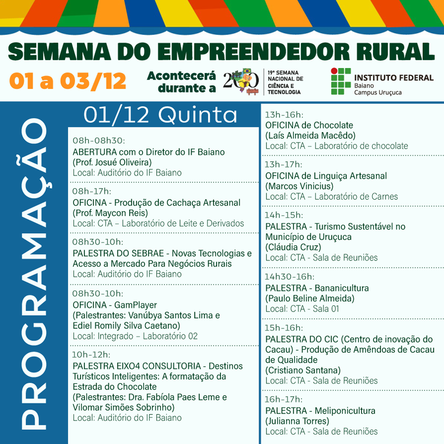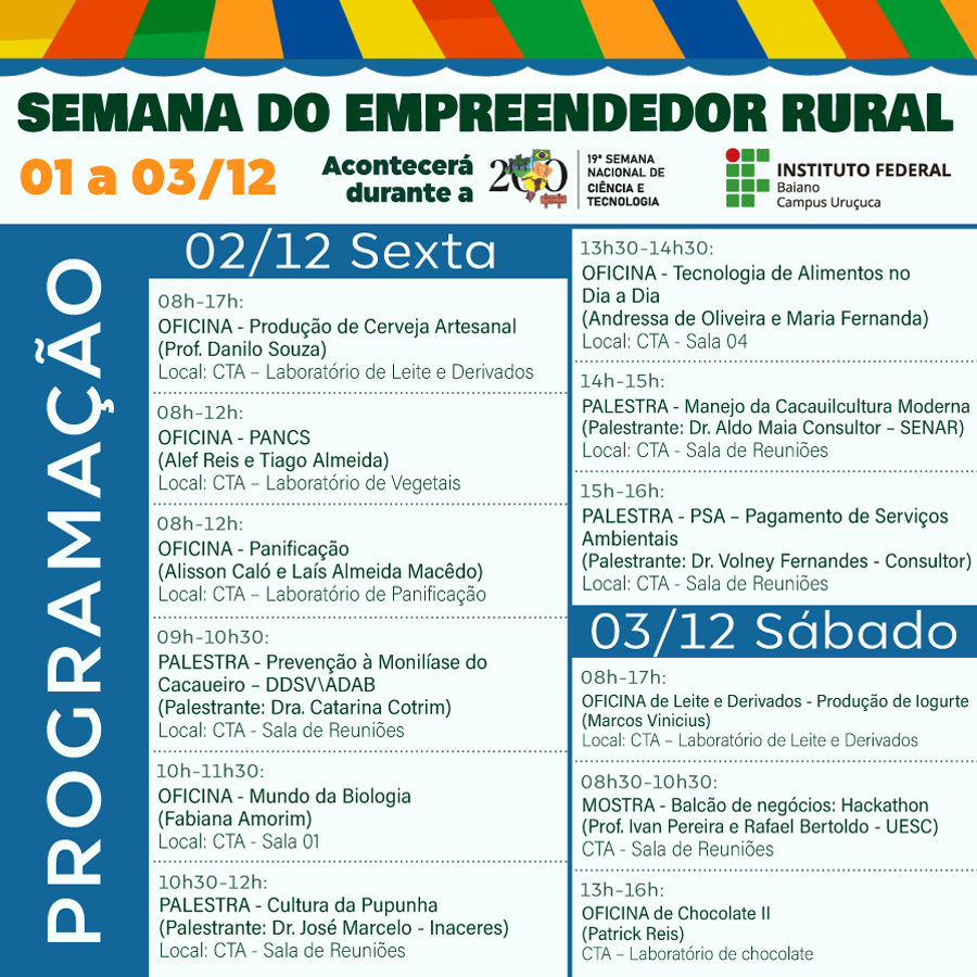 A Semana do Empreendedor Rural no IF Baiano – Campus Uruçuca faz parte da programação da 19° Semana Nacional Ciência e Tecnologia, com o tema “Bicentenário da Independência: 200 anos de Ciência, Tecnologia e Inovação no Brasil” e acontece entre os dias 01 e 03 de dezembro.