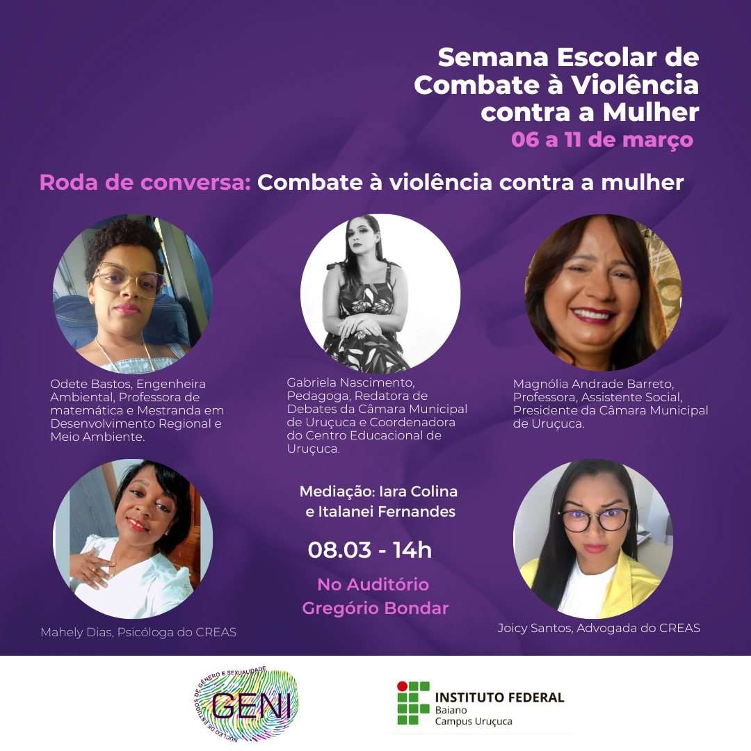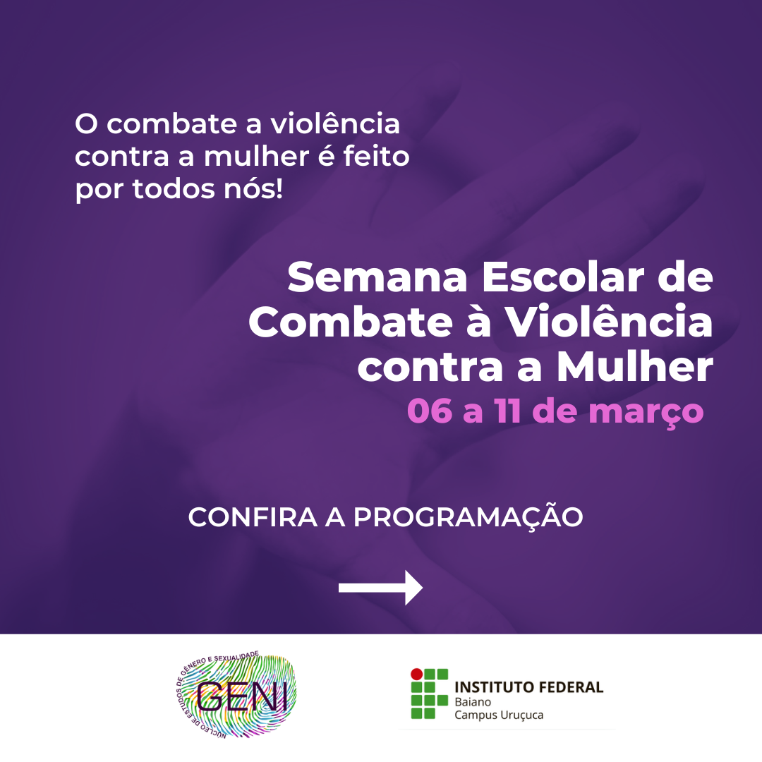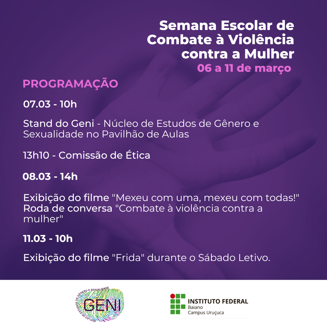 O Geni – Núcleo de Estudos em Gênero e Sexualidade, convida a todos e todas, servidores, colaboradores, estudantes e a comunidade externa, para participar da Semana Escolar de Combate à Violência Contra a Mulher, que ocorrerá de 06 a 11 de março, aqui no campus Uruçuca.