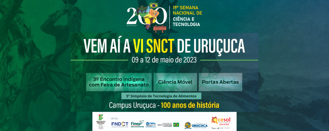 O IF Baiano – Campus Uruçuca realizará, no período de 09 a 12/05/2023, a VI SEMANA NACIONAL DE CIÊNCIA E TECNOLOGIA, com tema “Campus Uruçuca – 100 anos de história“. O objetivo é divulgar e popularizar a ciência, estimulando os(as) estudantes à iniciação científica. Essas atividades fazem parte da Semana Nacional de Ciência e Tecnologia fomentada pelo Ministério de Ciência e Tecnologia e Inovação e pelo CNPq.