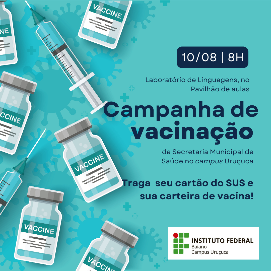 No dia 10/08, às 8h, no Laboratório de Linguagens, junte-se a nós para a tão aguardada campanha de vacinação em parceria com a Secretaria Municipal de Saúde.