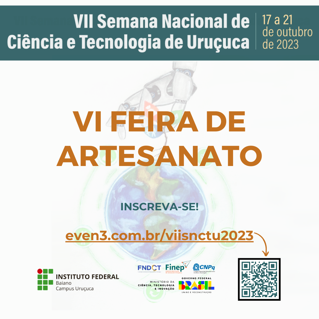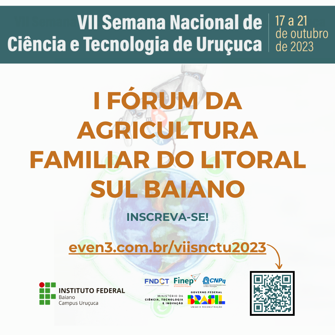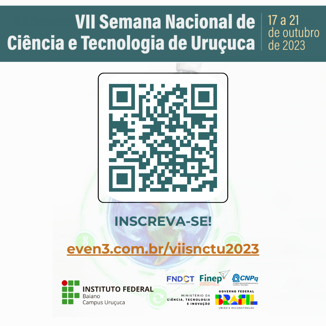 A VII Semana Nacional de Ciência e Tecnologia de Uruçuca ocorrerá de 17 de outubro a 21 de outubro de 2023, e tem como tema: Ciências Básicas para o Desenvolvimento Sustentável do Território Litoral Sul da Bahia.