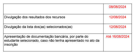 – O estudante poderá interpor recurso contra o resultado deste processo seletivo nos dias 07/08/24 e 08/08/24.
