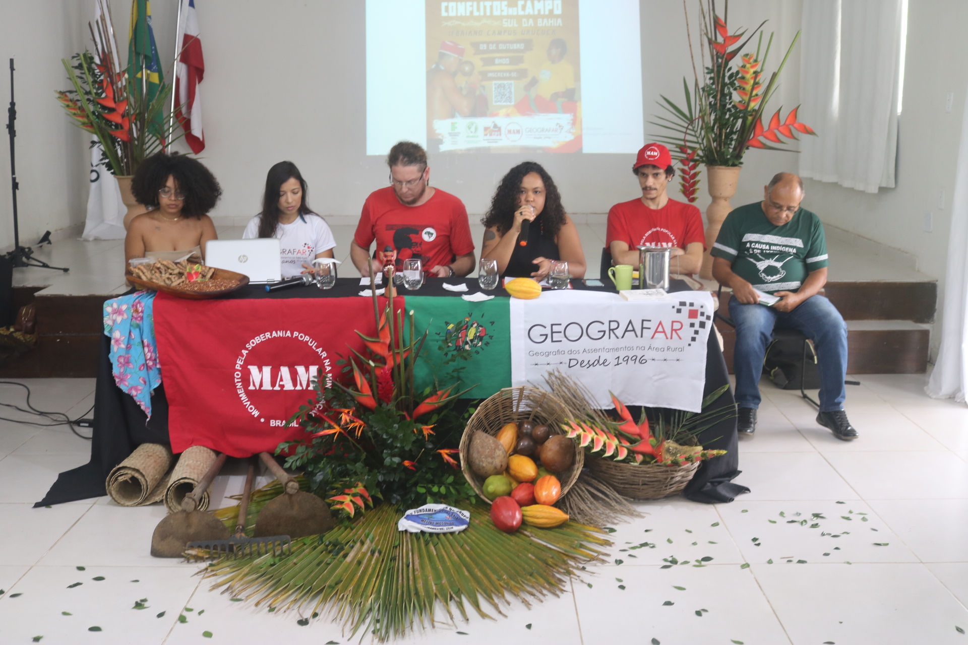 O evento contou com a participação de Helenna Castro, agente da Comissão Pastoral da Terra (CPT-BA), Mateus Britto, do Movimento pela Soberania Popular na Mineração (MAM-BA), Valdirene Rocha, integrante do grupo de Pesquisa GeografAR/UFBA, e Inara Silva, estudante de Comunicação Social da Universidade Estadual de Santa Cruz (UESC).