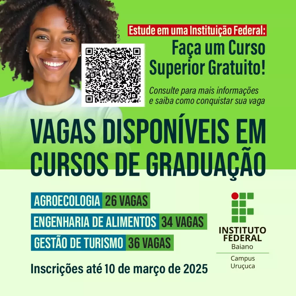 O Instituto Federal Baiano (IF Baiano) – Campus Uruçuca está com inscrições abertas para ingresso em seus cursos de graduação no ano letivo de 2026. A seleção oferece vagas nos seguintes cursos: