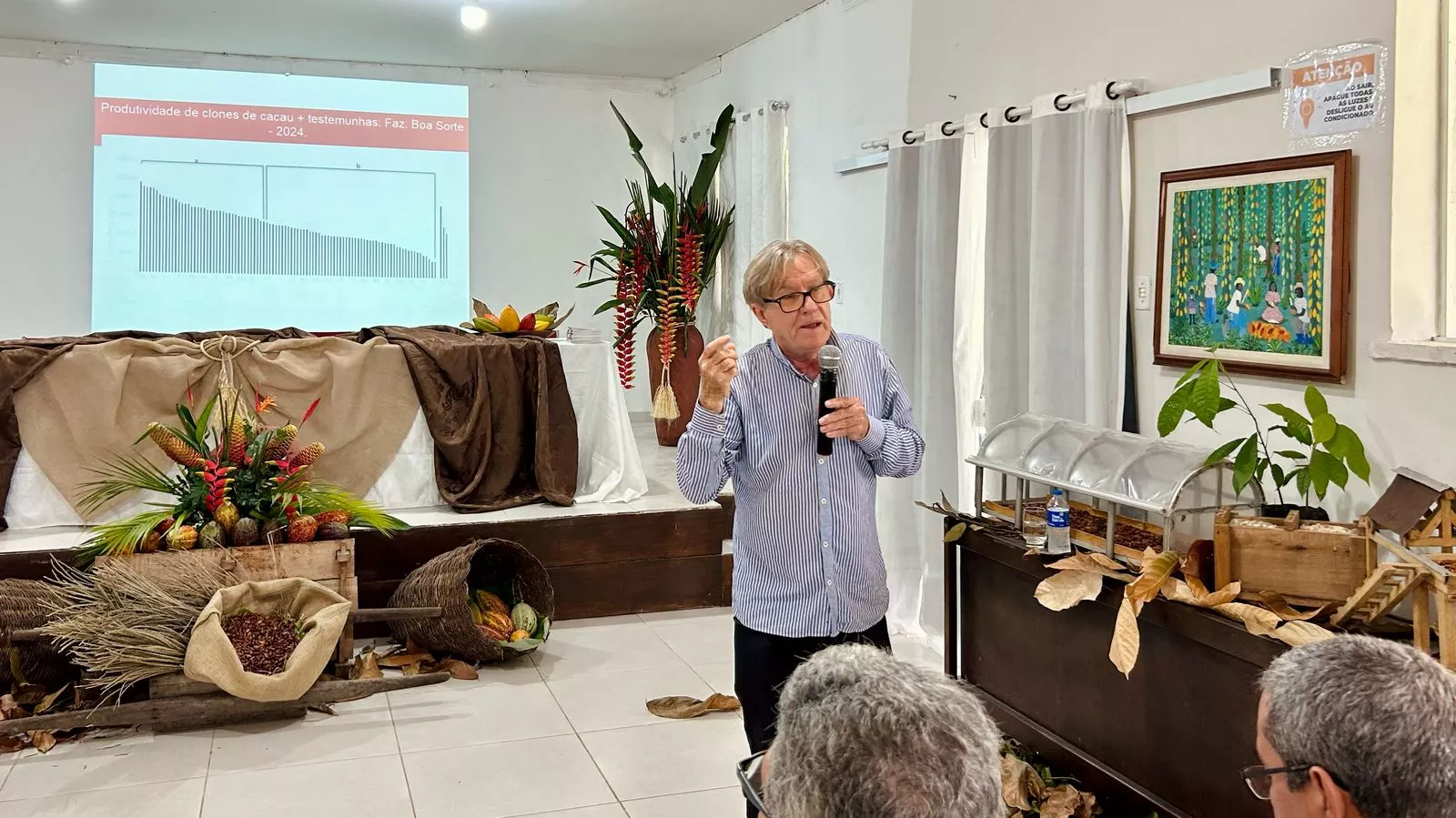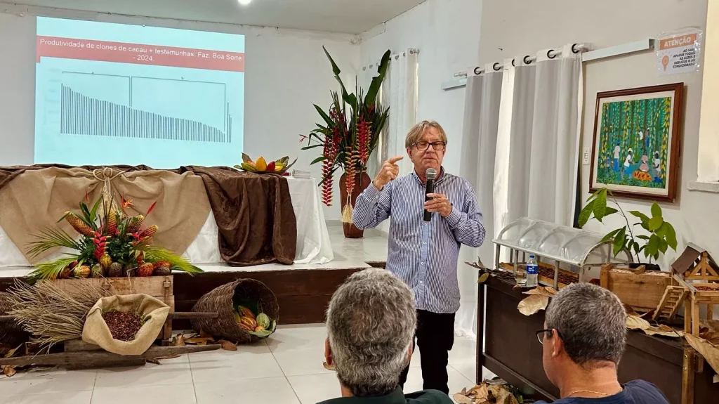✔ Melhoramento Genético do Cacaueiro – Ministrada pelo pesquisador Dário Ahnert, a palestra abordou as inovações no desenvolvimento de variedades de cacau mais produtivas e resistentes.