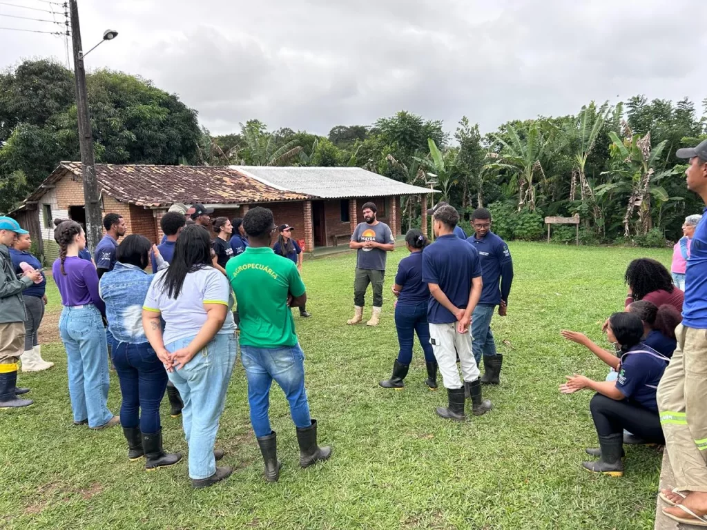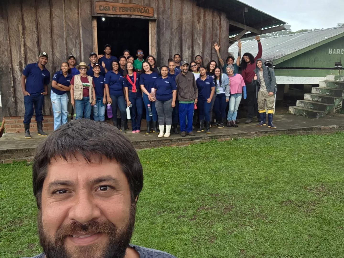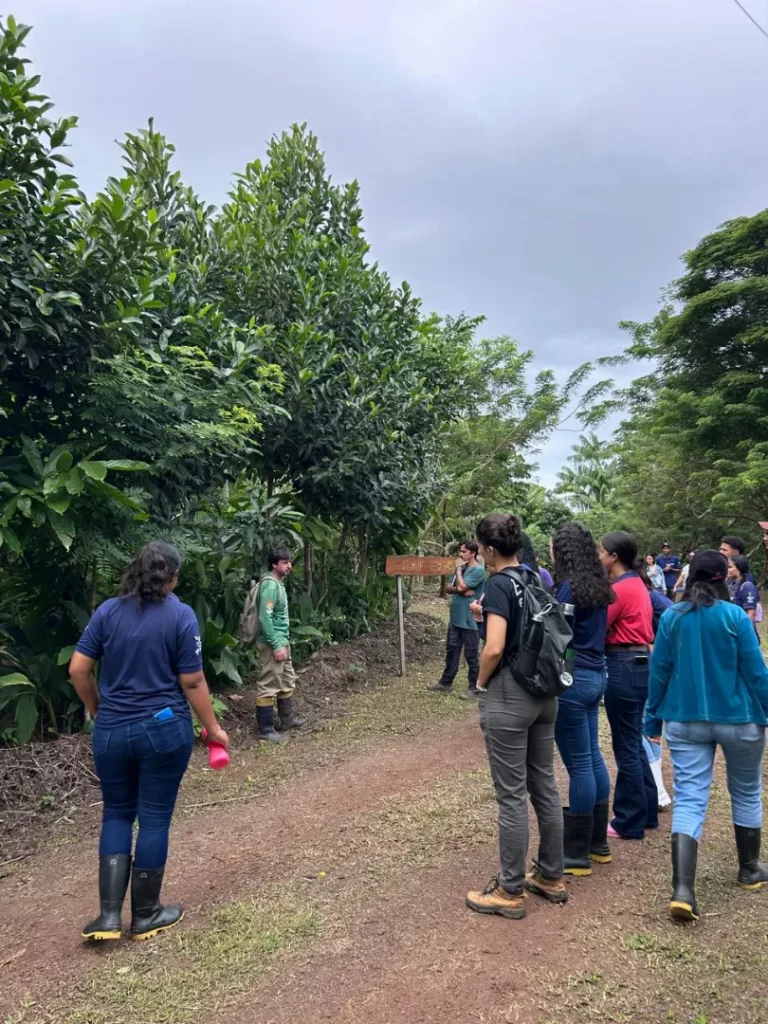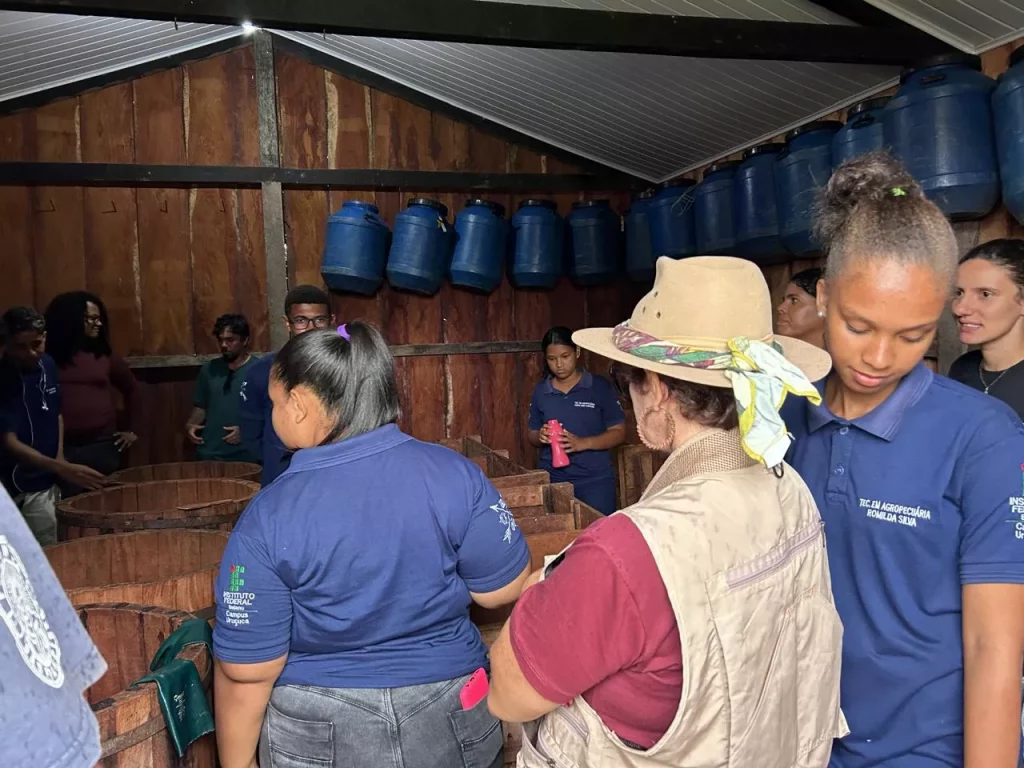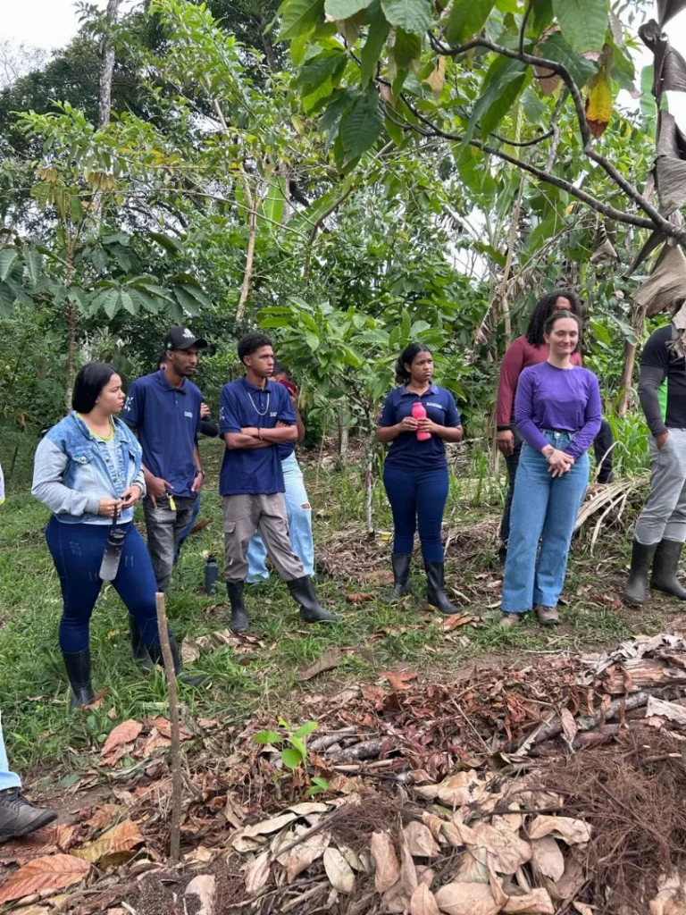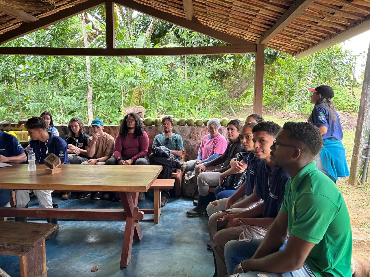 Os(as) estudantes tiveram a oportunidade de conhecer de perto o manejo de uma Agrofloresta, a produção de cacau fino, os processos de beneficiamento dos produtos da fazenda, além de entender como a propriedade é administrada e como é construída a relação com os colaboradores.