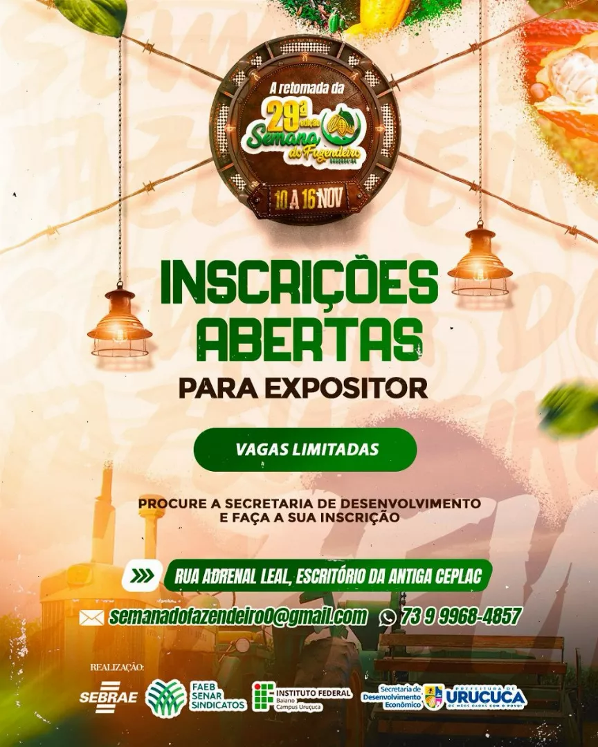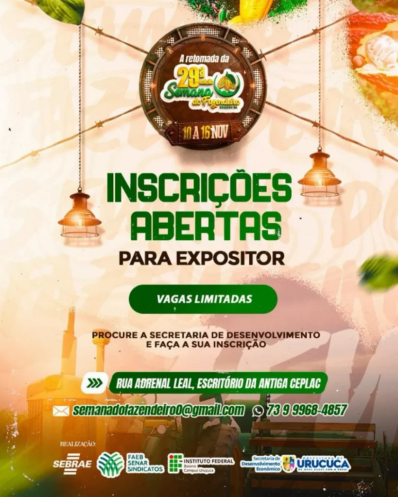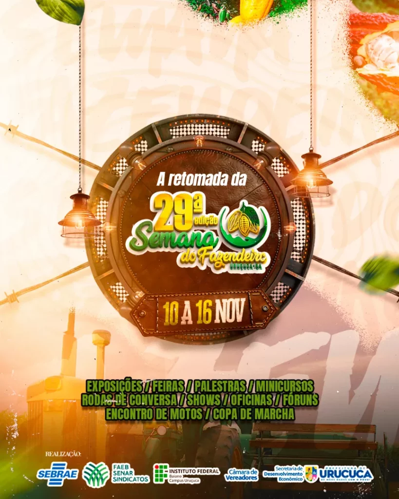 Entre os dias 10 e 16 de novembro de 2025, a cidade de Uruçuca (BA) sediará a 29ª Semana do Fazendeiro, um dos eventos mais tradicionais e emblemáticos da Região Cacaueira da Bahia. A iniciativa é fruto de uma parceria entre o Instituto Federal Baiano – Campus Uruçuca, a Prefeitura de Uruçuca e diversas instituições regionais e nacionais.