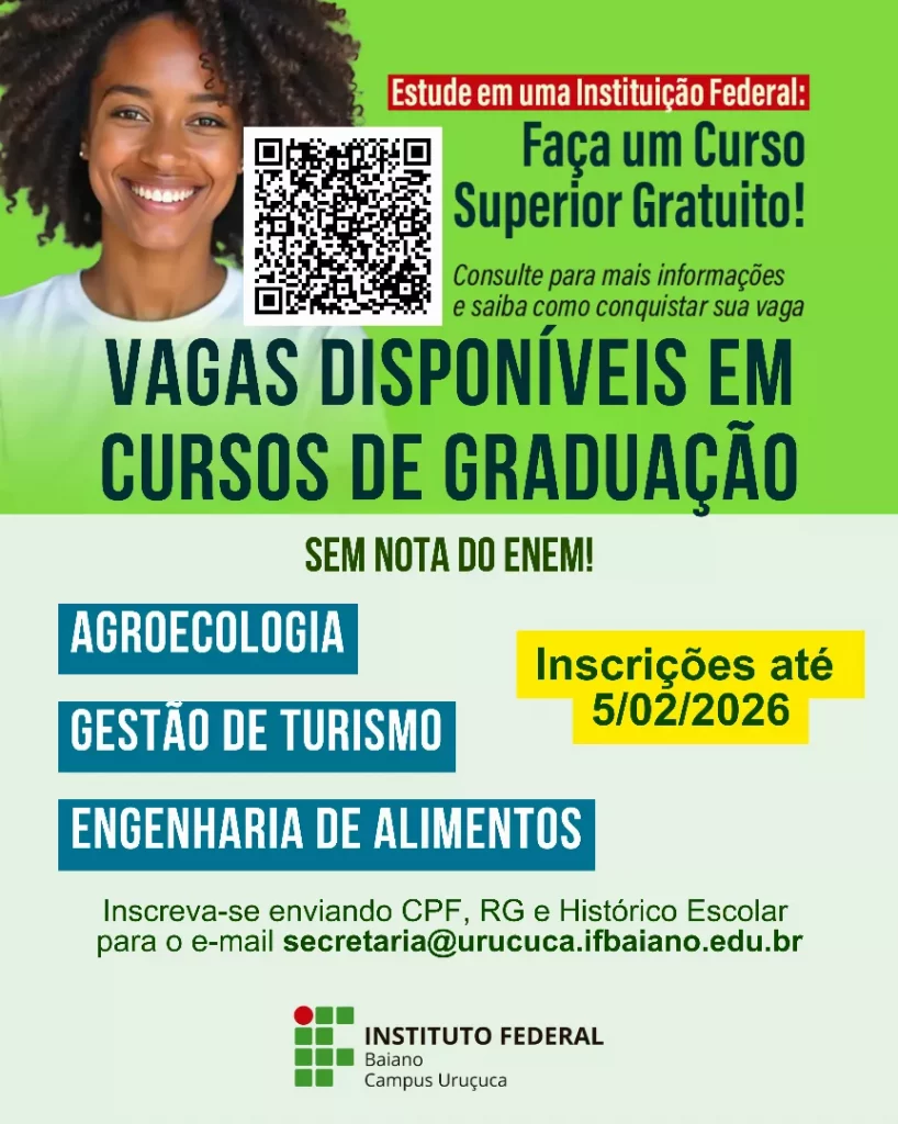 O Instituto Federal Baiano (IF Baiano) – Campus Uruçuca está com inscrições abertas para ingresso em seus cursos de graduação no ano letivo de 2026. A seleção oferece vagas nos seguintes cursos: