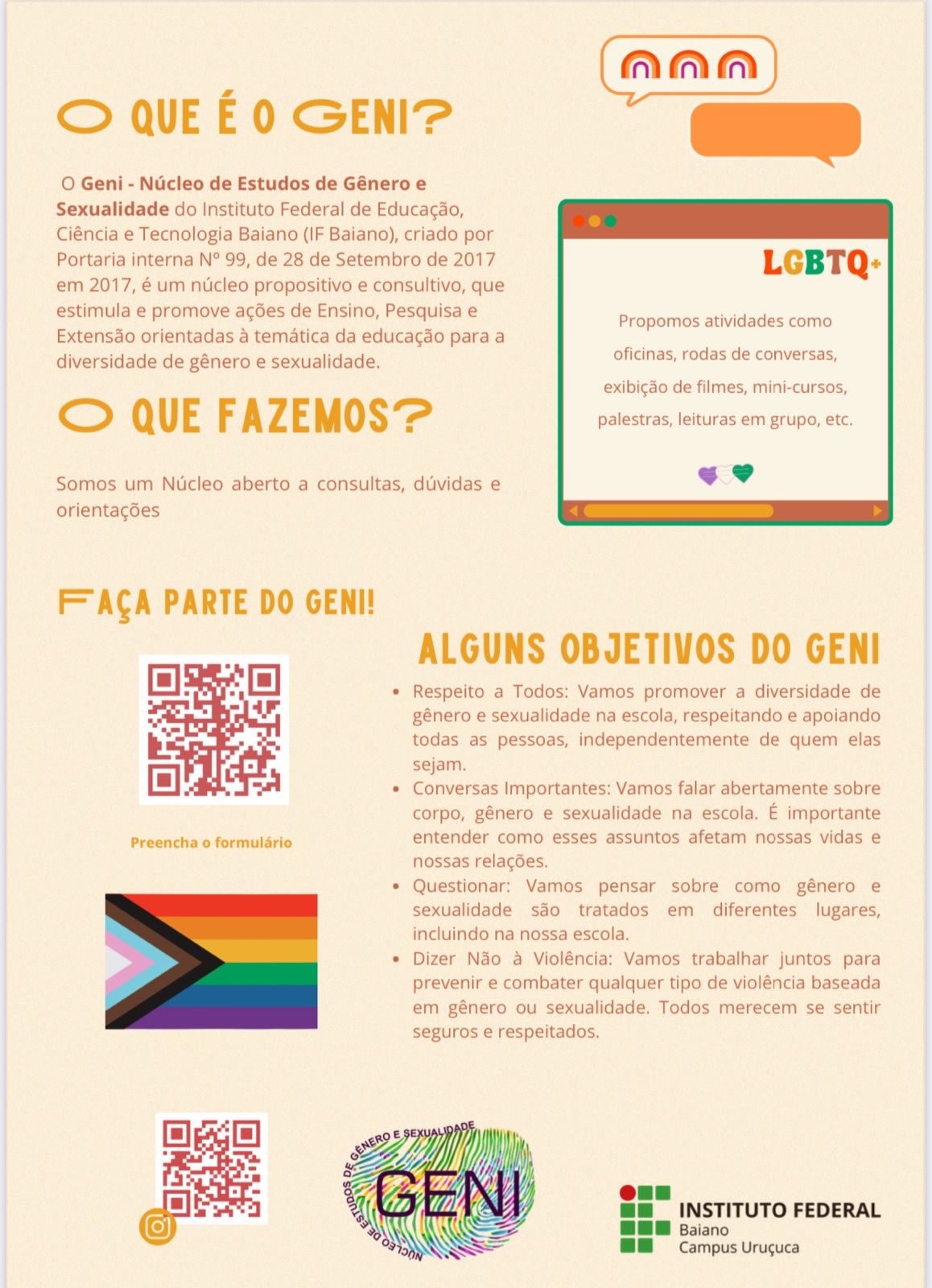 O Geni é um núcleo propositivo e consultivo do Instituto Federal de Educação, Ciência e Tecnologia Baiano (IF Baiano), que estimula e promove ações de Ensino, Pesquisa e Extensão voltadas à educação para a diversidade de gênero e sexualidade.