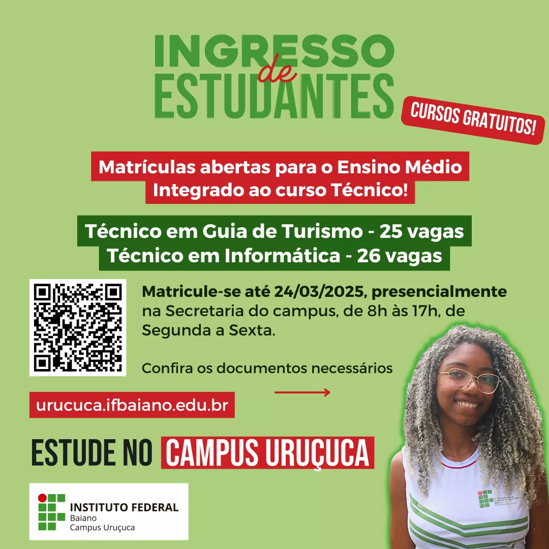 A DIRETORA-GERAL DO INSTITUTO FEDERAL DE EDUCAÇÃO, CIÊNCIA E TECNOLOGIA BAIANO – CAMPUS URUÇUCA, no uso de suas atribuições legais torna pública a abertura das inscrições do processo seletivo para ingresso em 2025. São ofertadas vagas para cursos de Educação Profissional Técnica para alunos que terminaram o ensino fundamental.