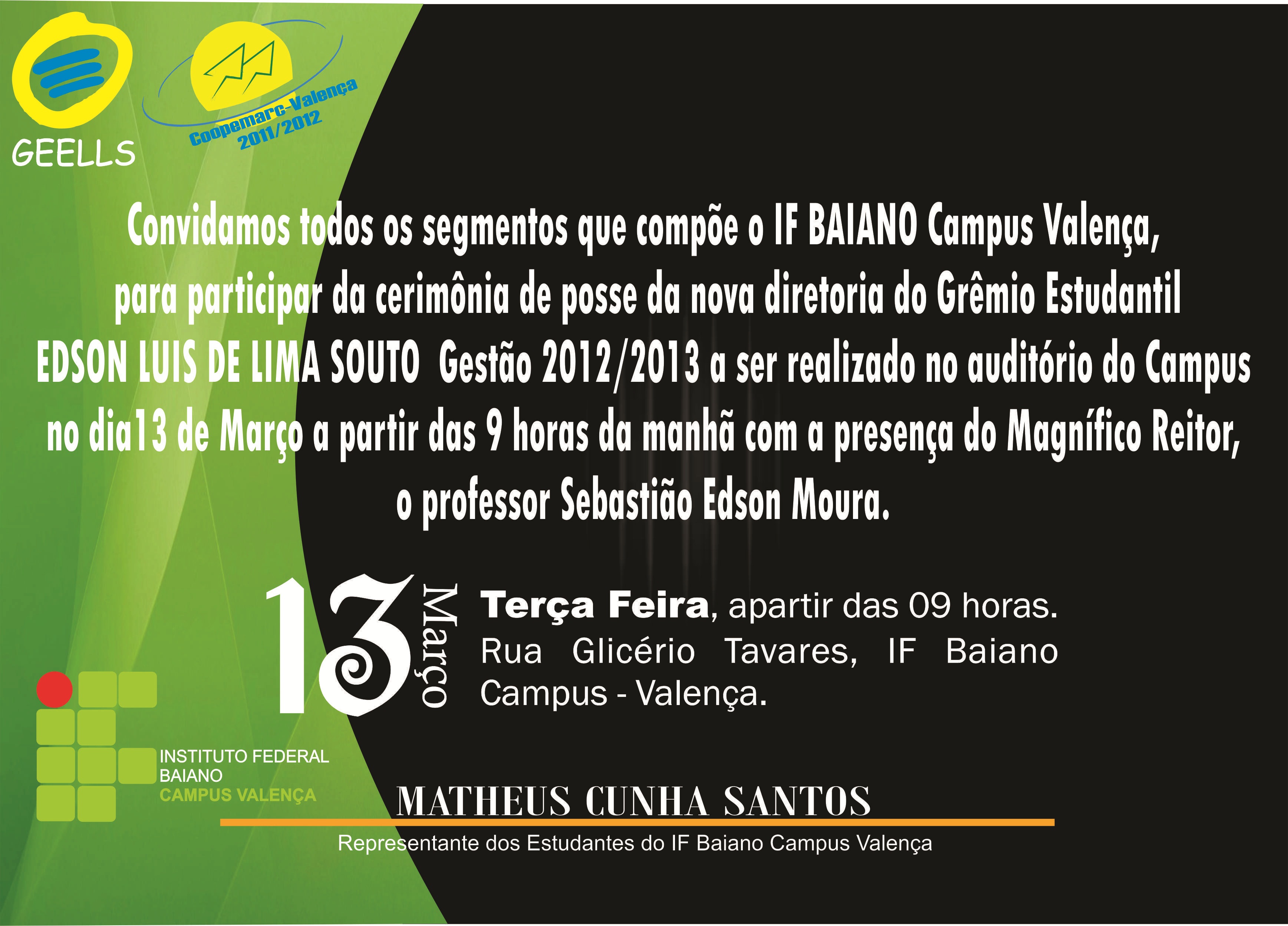 Os estudantes eleitos pela comunidade discente do Câmpus Valença para representá-la no Novo Grêmio Estudantil durante a gestão de 2012/2013 serão empossados nesta terça-feira (13/03) às 09:00h, no Auditório do Câmpus.