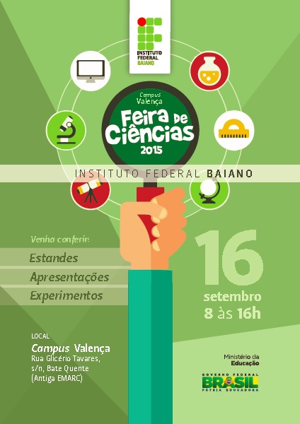 Ontem (16/09/2015) ocorreu a primeira Feira de Ciências do campus Valença do IF Baiano. Evento em que alunos realizam experimentos científicos e explicam seus fundamentos para a comunidade participante. Alunos e professores de diversas escolas da região vieram prestigiar o evento que serve, principalmente, como incentivo ao ingressos de novos alunos na instituição além de desenvolver a curiosidade dos jovens ao mundo de pesquisas científicas.