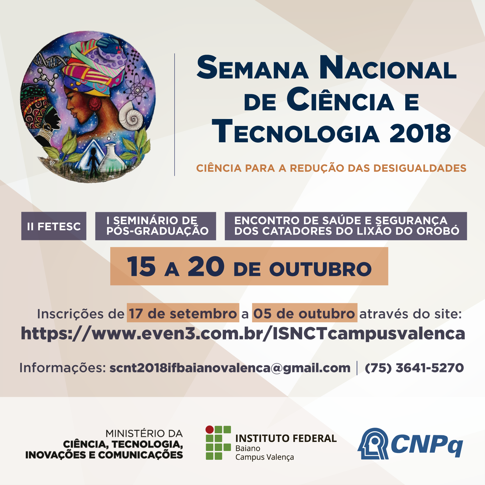 A SNCT 2018, a realizar-se no município de Valença no período de 15 e 20 de outubro, está sob a coordenação do Instituto Federal Baiano – IFBaiano Campus Valença e visa fomentar os usos sociais da ciência e da tecnologia de modo a favorecer a socialização das diferentes possibilidades de combate à desigualdade social a partir da popularização e da divulgação da ciência e da tecnologia.