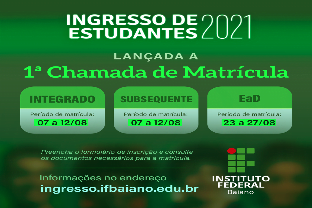 Veja detalhes no edital de matrícula, em ingresso.ifbaiano.edu.br.