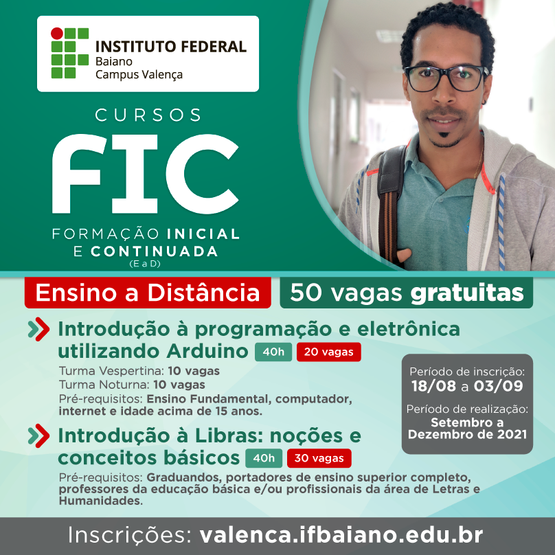 Estão abertas, a partir de hoje, 18, as inscrições para dois cursos de qualificação profissional, da modalidade FIC (Formação Inicial e Continuada), que serão ofertados no Campus Valença. Estão disponíveis 20 vagas para o curso Introdução à programação e eletrônica utilizando Arduino e 30 vagas para o curso Introdução à Libras: noções e conceitos básicos.