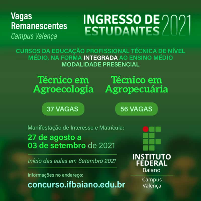 O Instituto Federal Baiano, Campus Valença, através do Edital nº 02 e Edital nº 03, de 24 de agosto de 2021, torna pública a abertura de inscrições para vagas remanescentes oriundas do processo de ingresso de estudantes em 2021, nos cursos da Educação Profissional Técnica de Nível Médio, na forma Integrada e Subsequente ao Ensino Médio – na modalidade presencial.