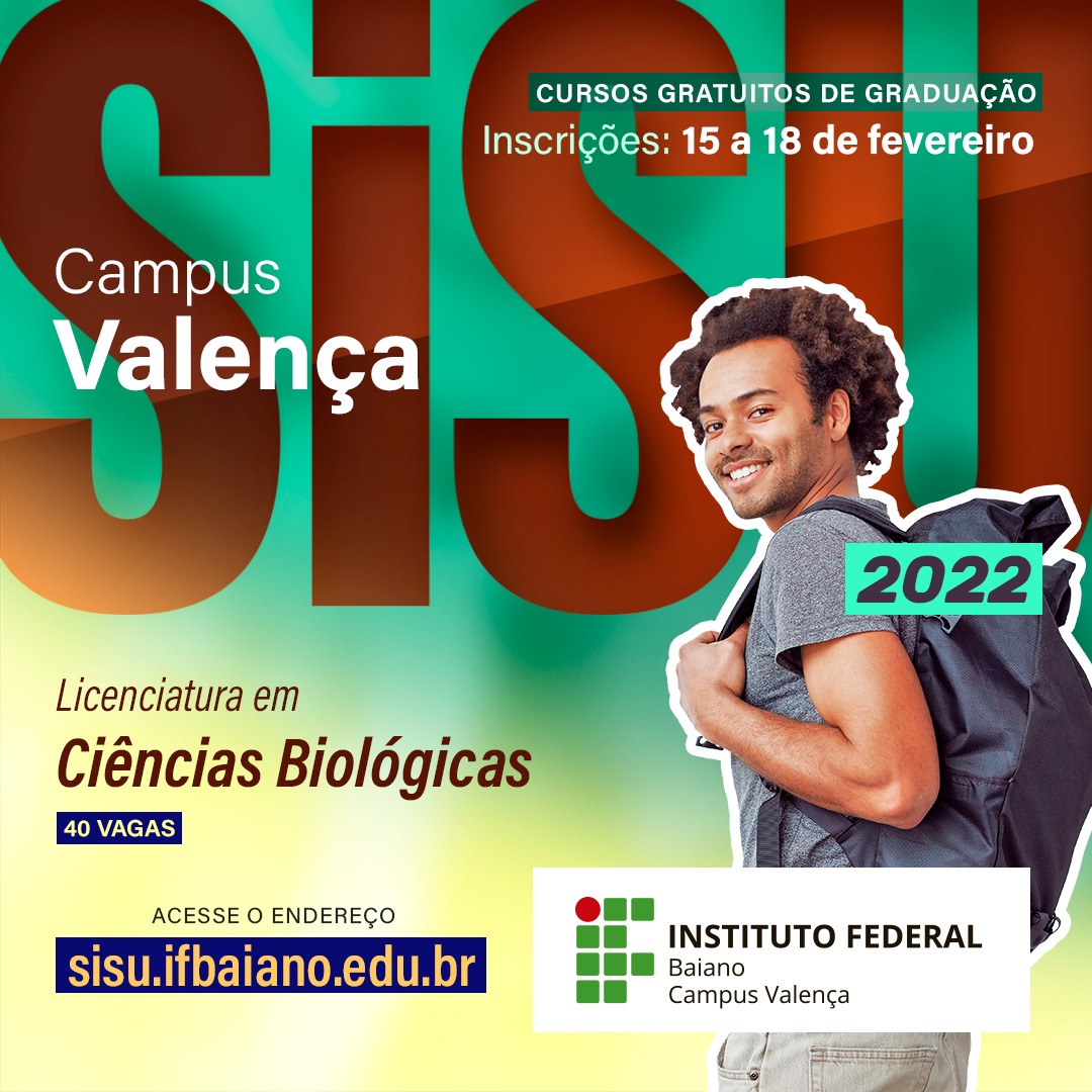 O Instituto Federal Baiano (IF Baiano) tem 860 vagas em cursos de graduação, para ingresso em 2022, sendo ofertadas via Sistema de Seleção Unificada (SiSU). Desse total, o Campus Valença ofertará 40 vagas para o curso de Licenciatura em Ciências Biológicas. Interessados podem se inscrever, exclusivamente pela internet, por meio do site https://sisu.mec.gov.br/.