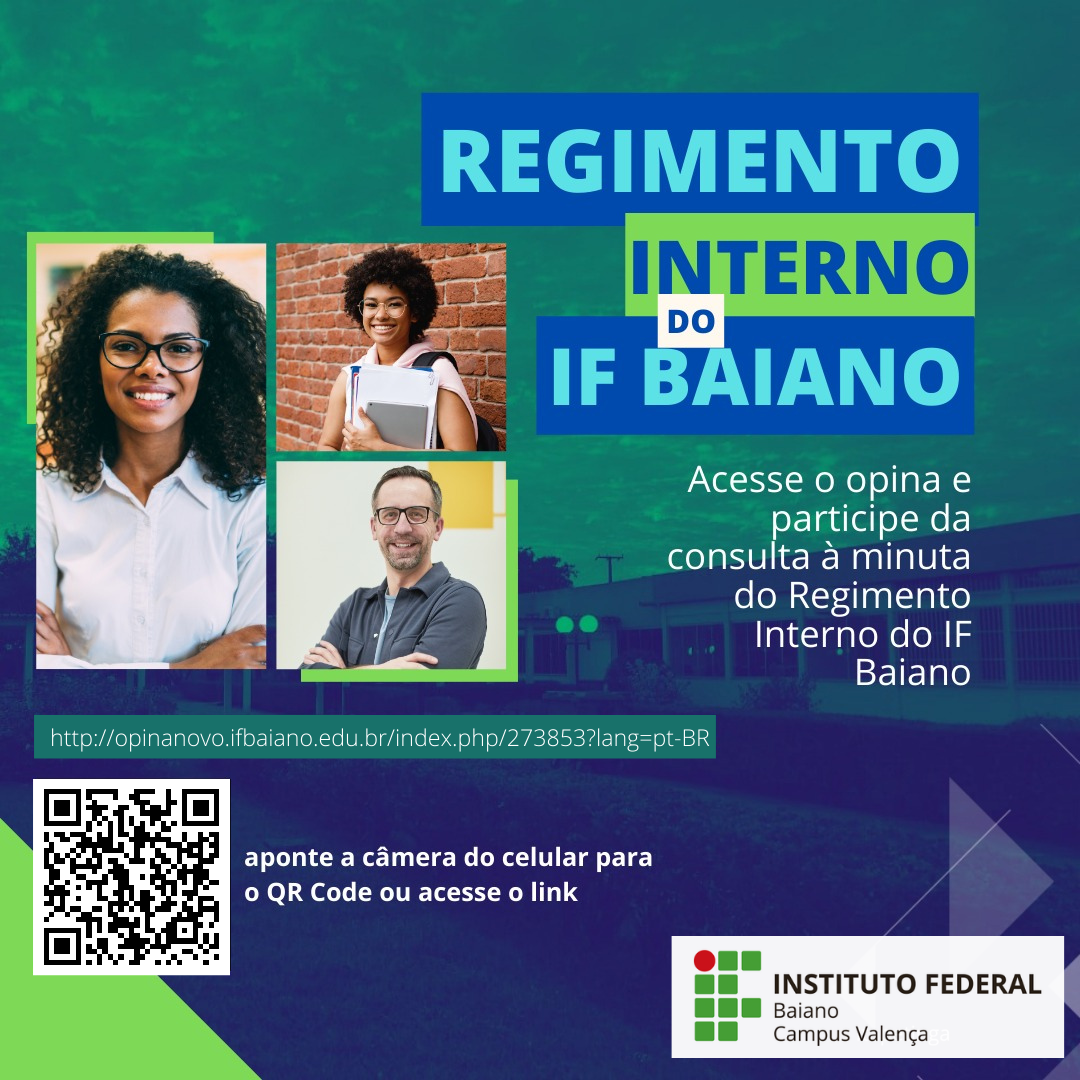 O Instituto Federal Baiano (IF Baiano) – Campus Valença, por meio de Consulta Pública, disponibiliza para apreciação da comunidade a minuta de Regimento Interno da estrutura organizacional e as competências das unidades administrativas dos campi Itapetinga, Teixeira de Freitas, Uruçuca e Valença.