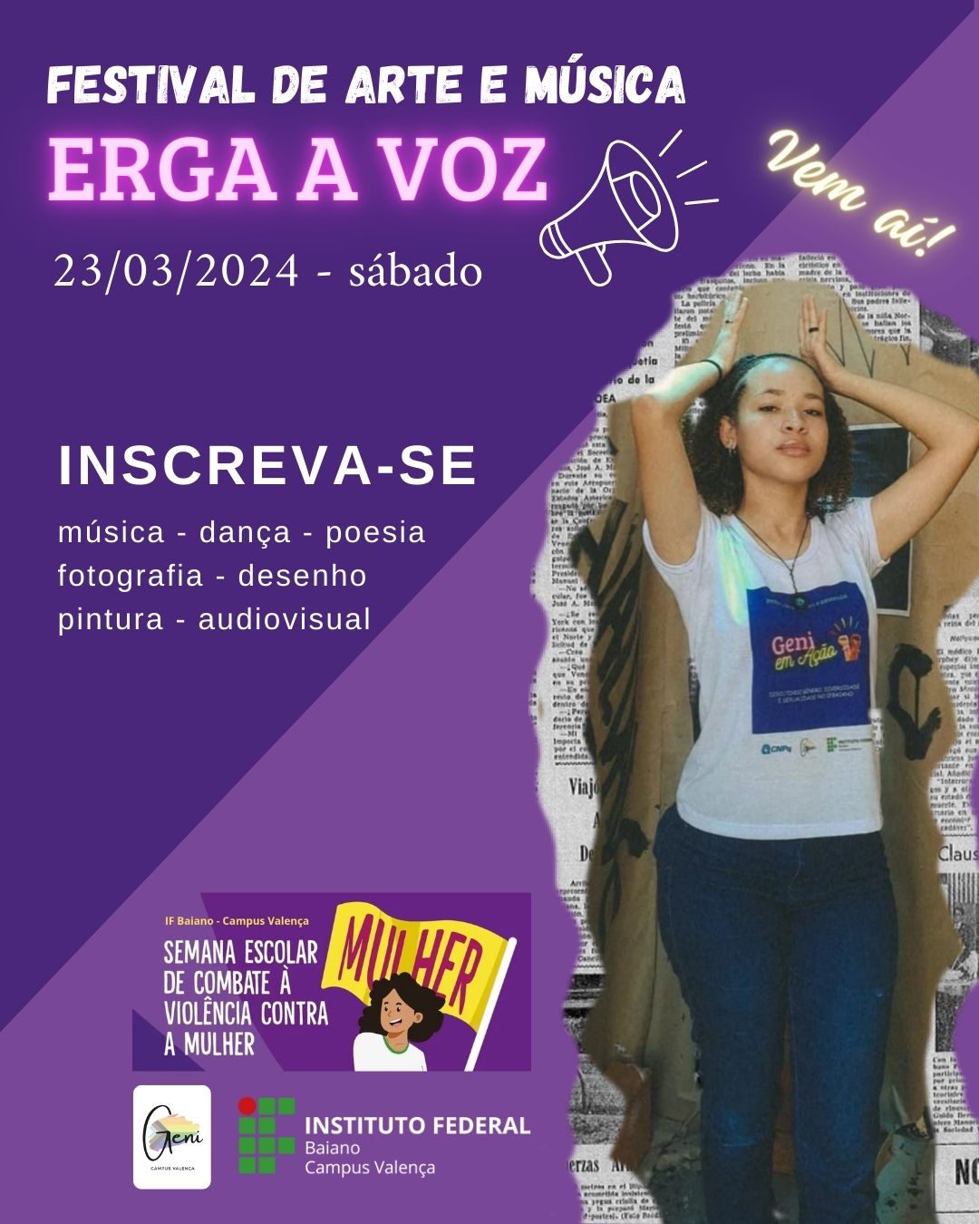 No sábado, dia 23/03, aconteceu a culminância da Semana Escolar de Combate à Violência contra a Mulher, com o Festival de Arte e Música Erga a Voz, com o apoio da PROPES.