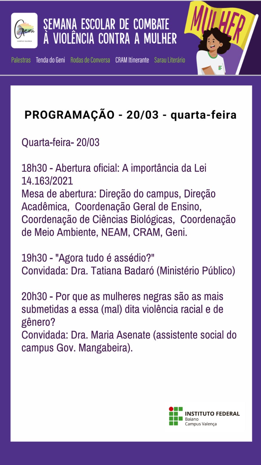 A Semana Escolar de Combate à Violência contra a Mulher é uma ação institucional, que faz parte do calendário acadêmico, e ocorre anualmente no mês de março, no IF Baiano. Este evento cumpre a Lei 14.164/21, que inclui “nos currículos conteúdos relativos aos direitos humanos e à prevenção de todas as formas de violência contra a criança, o adolescente e a mulher”.