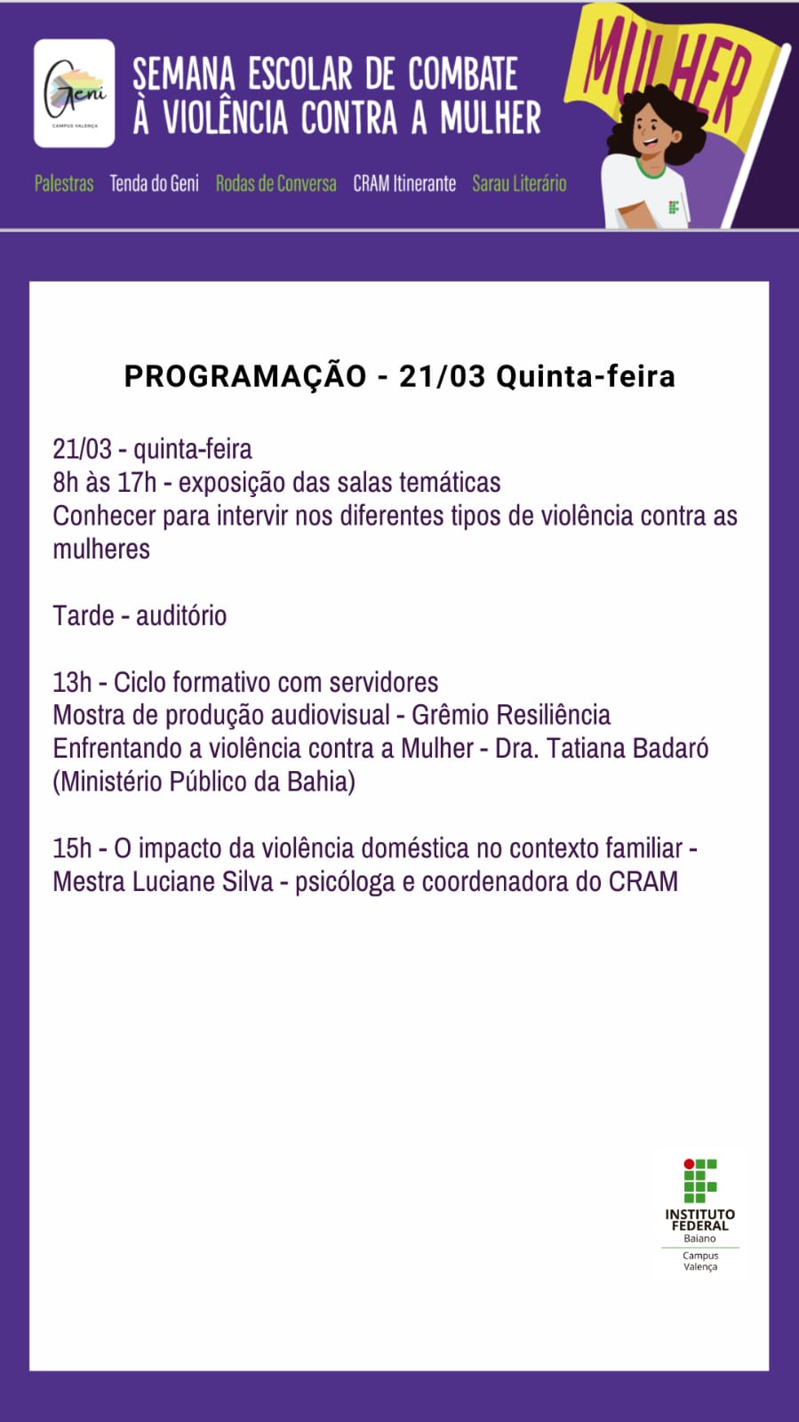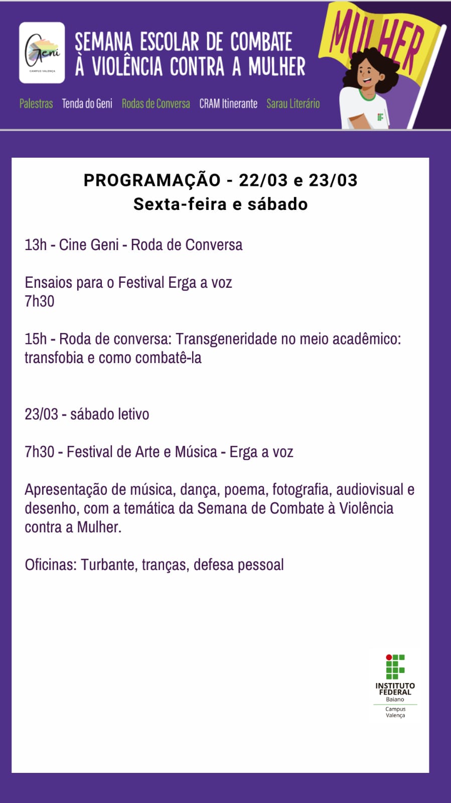 A segunda edição da Semana Escolar de Combate à Violência contra a Mulher do IF Baiano campus Valença, realizada entre os dias 20 e 23 de março, de 2023, teve como objetivo promover atividades para difundir conhecimento sobre a Lei Maria da Penha e os mecanismos de assistência e de denúncias existentes contra violência doméstica; integrar a comunidade no combate à violência contra a mulher; capacitar educadores; impulsionar a reflexão crítica entre estudantes, profissionais da educação e comunidade escolar sobre a prevenção e o combate à violência contra a mulher.