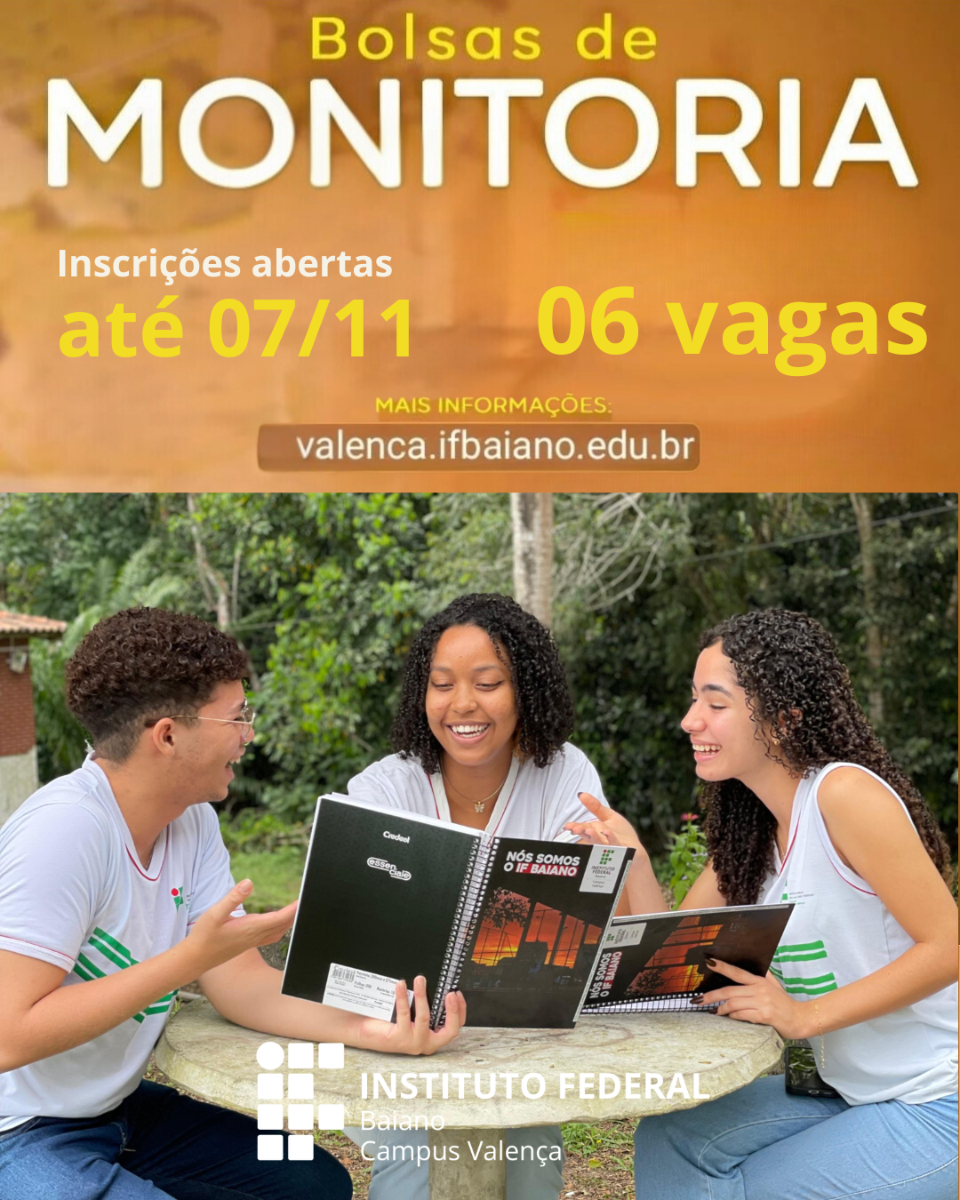 O INSTITUTO FEDERAL DE EDUCAÇÃO, CIÊNCIA E TECNOLOGIA BAIANO, CAMPUS VALENÇA, por intermédio do seu Diretor-Geral, Geovane Lima Guimarães, conforme lhe confere a portaria nº 453 de 19 de março de 2018, publicada no DOU de 20 de março de 2018 combinado com o que dispõe a lei 8.112/90, de acordo com as disposições legais em vigor, torna pública a abertura das inscrições do Processo Seletivo para Concessão de Bolsas de Monitoria para os Cursos da Educação Profissional Técnica de Nível Médio e de Graduação.