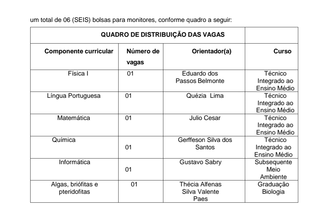 Sãos vagas ofertadas com bolsa de 300,00 mensais. Confira abaixo o quadro de distribuição das disciplinas:
