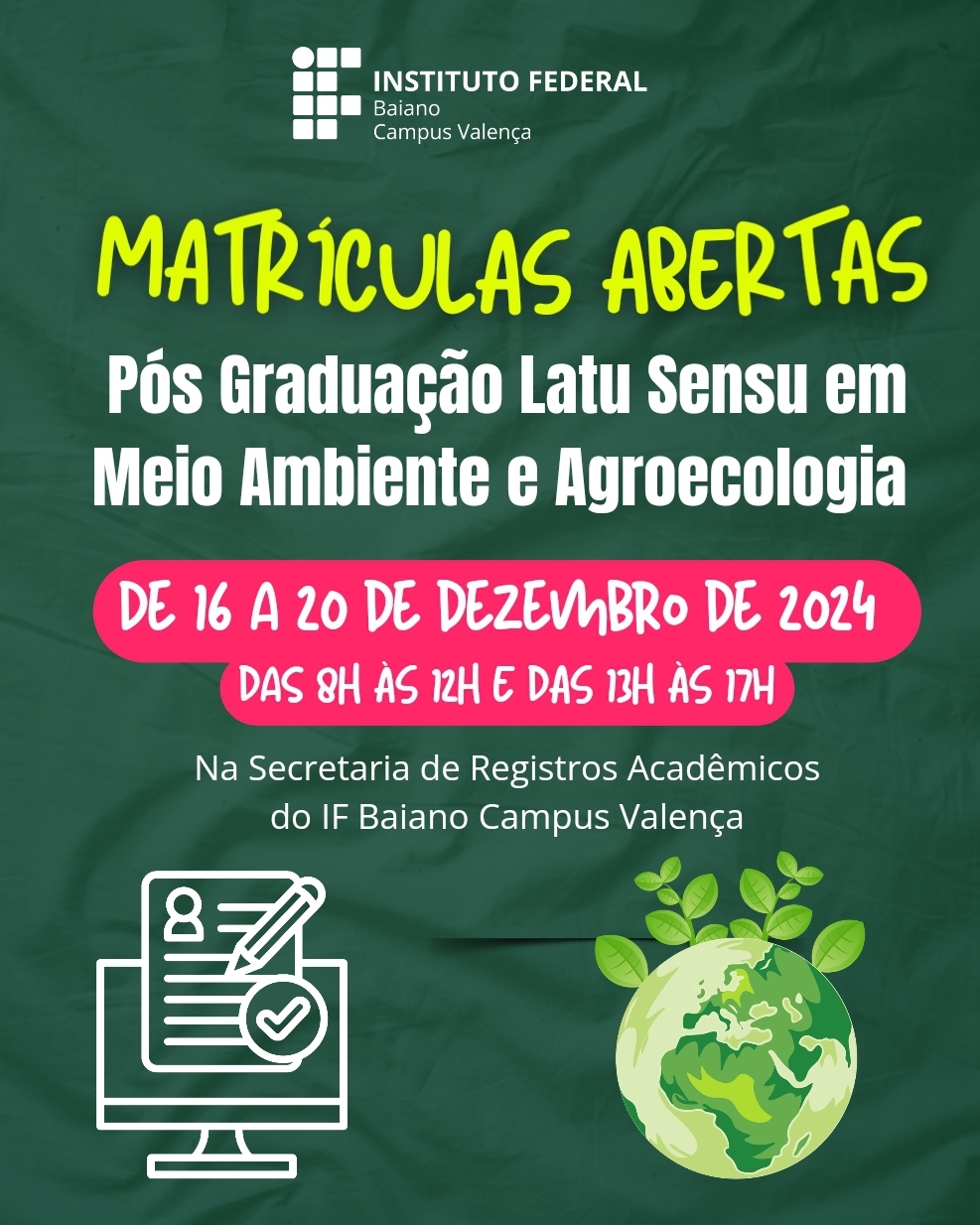 O Diretor-Geral do Instuto Federal de Educação, Ciência e Tecnologia Baiano, Campus Valença, nomeado sob Portaria Nº 286, de 18/03/2022, no D.O.U. de 21/03/2022, de acordo com as disposições da legislação em vigor, TORNA PÚBLICO, através deste Edital, as condições de matrícula dos(as) candidatos(as)APROVADOS(AS), para o CURSO DE PÓS-GRADUAÇÃO LATO SENSU EM MEIO AMBIENTE E AGROECOLOGIA PARA O CAMPUS VALENÇA. conforme Edital nº 189, de 04 de setembro de 2024.