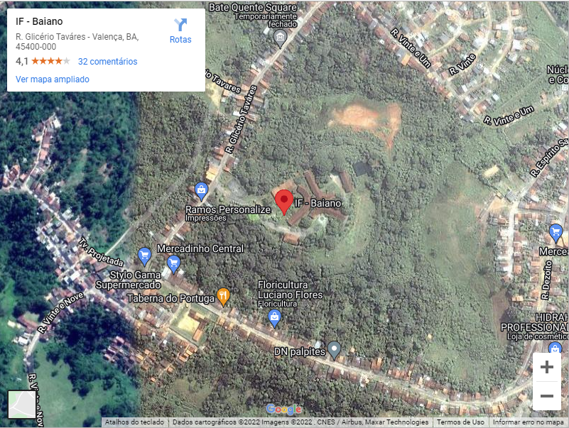 A sede do IF Baiano Campus Valença está localizada à Rua Glicério Tavares, S/N – Bate Quente, Valença-Ba, CEP: 45.400-000.