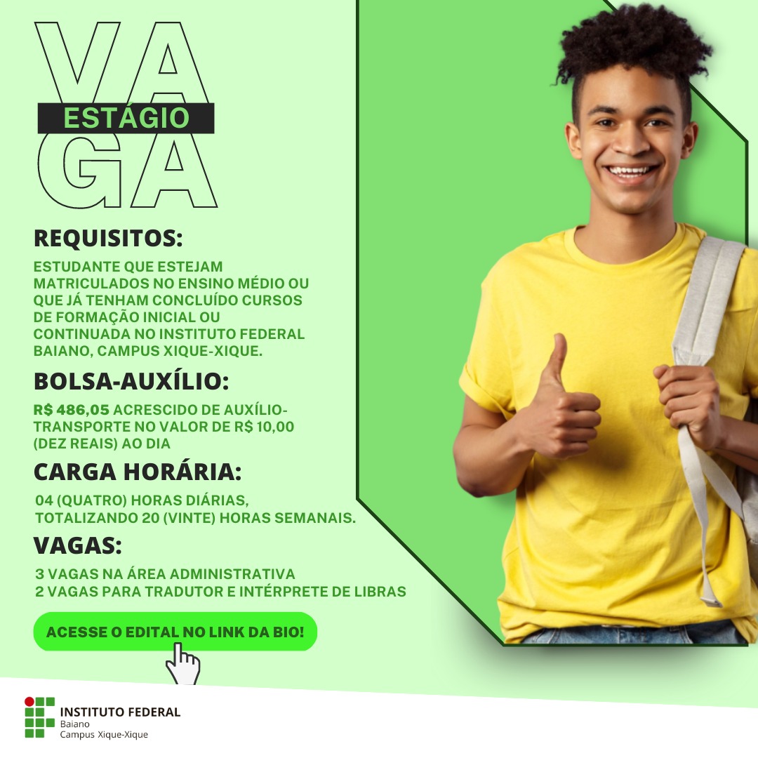 Mais informações acesse o link: https://concurso.ifbaiano.edu.br/portal/selecao-estagiario-xique-xique-maio-2023