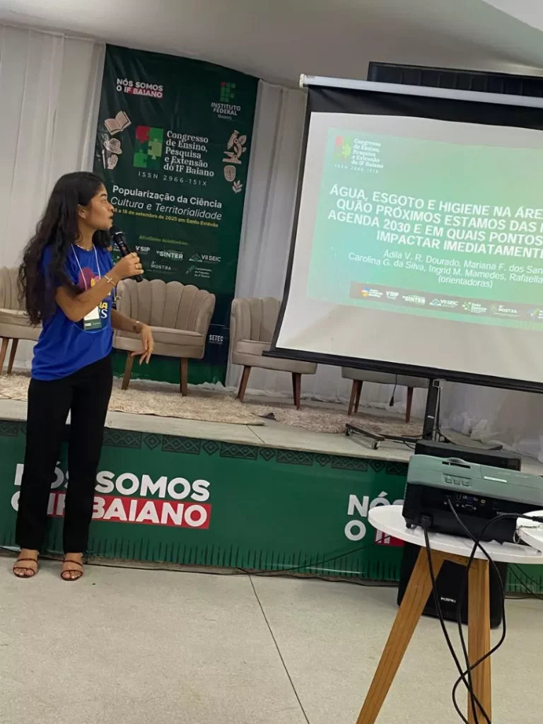 – ÁGUA, ESGOTO E HIGIENE NA ÁREA RURAL: O QUÃO PRÓXIMOS ESTAMOS DAS METAS DA AGENDA 2030 E EM QUAIS PONTOS PODEMOS IMPACTAR IMEDIATAMENTE? Apresentação oral realizada na 4ª Edição do Congresso de Ensino, Pesquisa e Extensão do IF Baiano, Santo Estevão, Bahia (Figura 5), por Ádila Dourado.